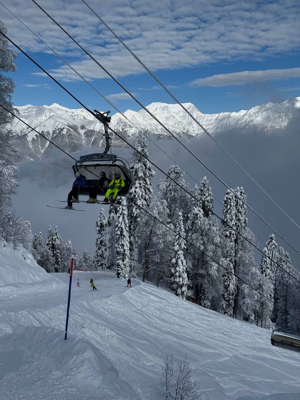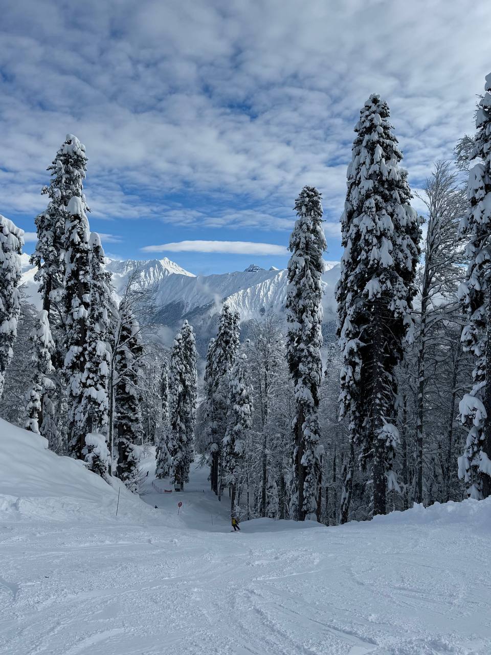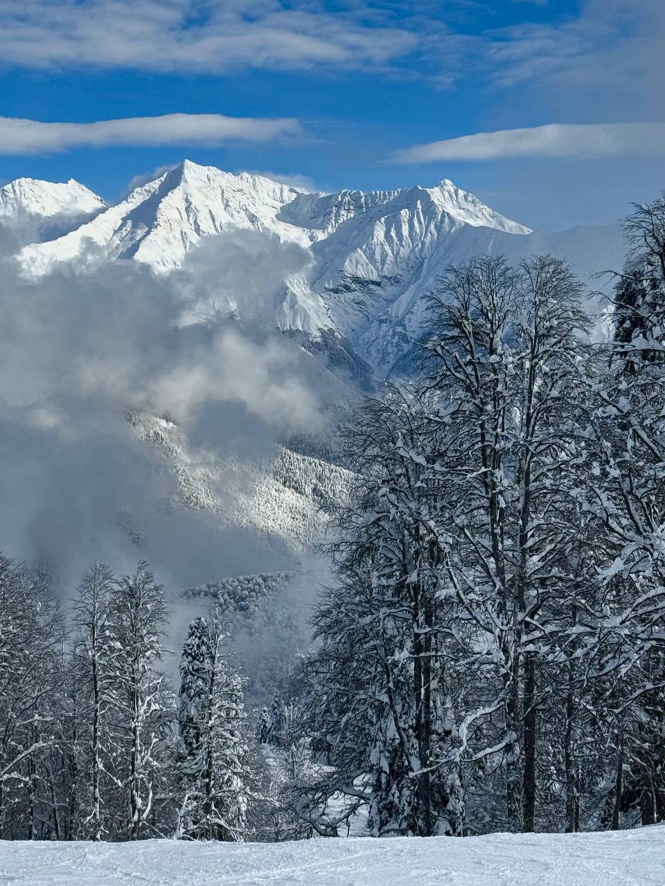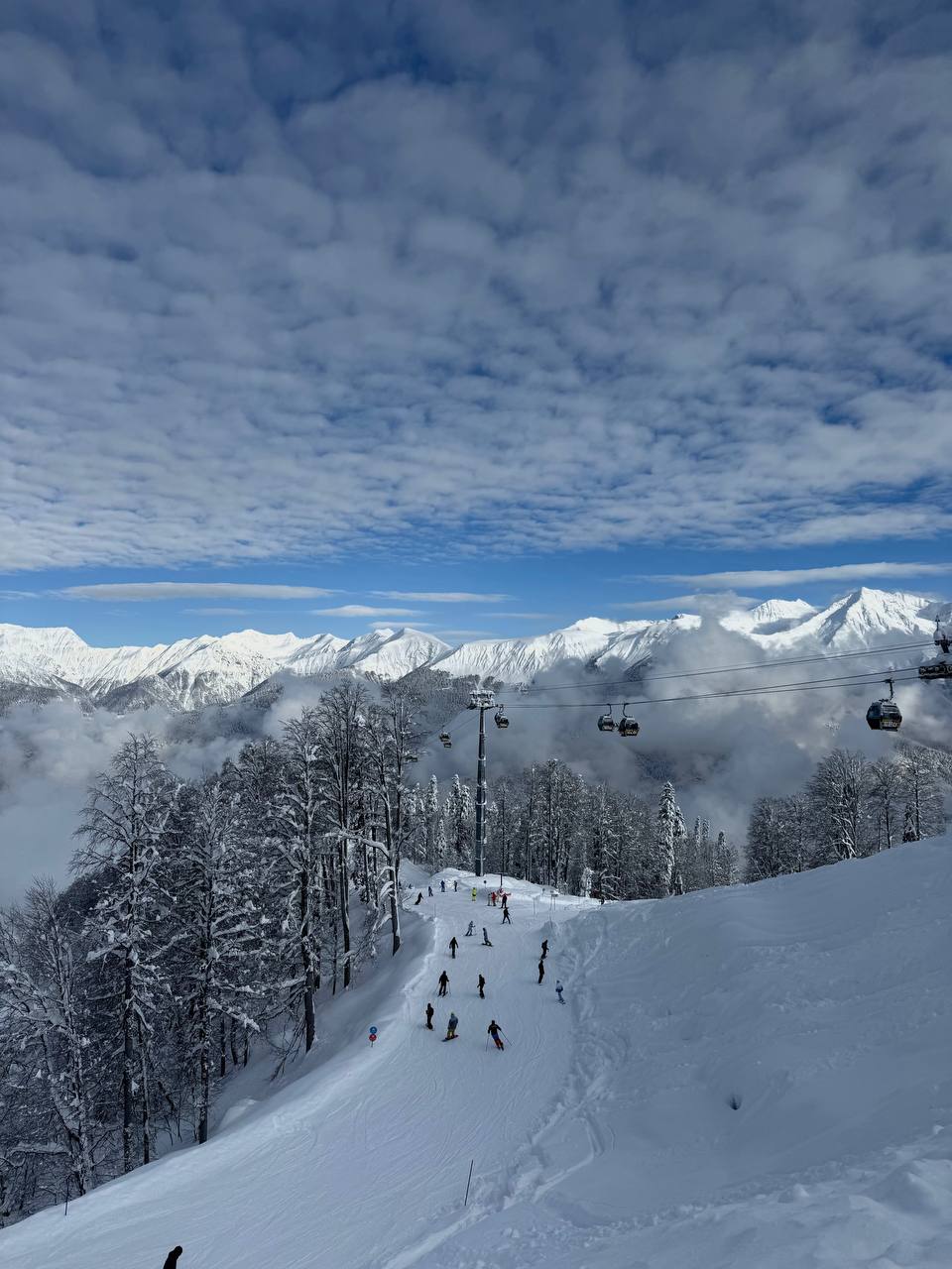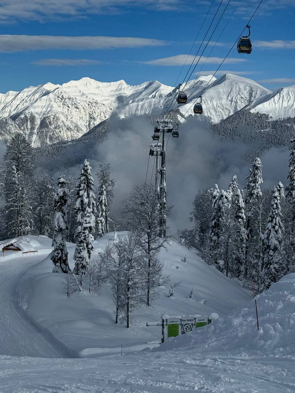 Сегодня на склонах настоящий праздник для глаз и души! Голубое небо, солнце и снежные вершины вокруг - невозможно не остановиться и насладиться моментом.