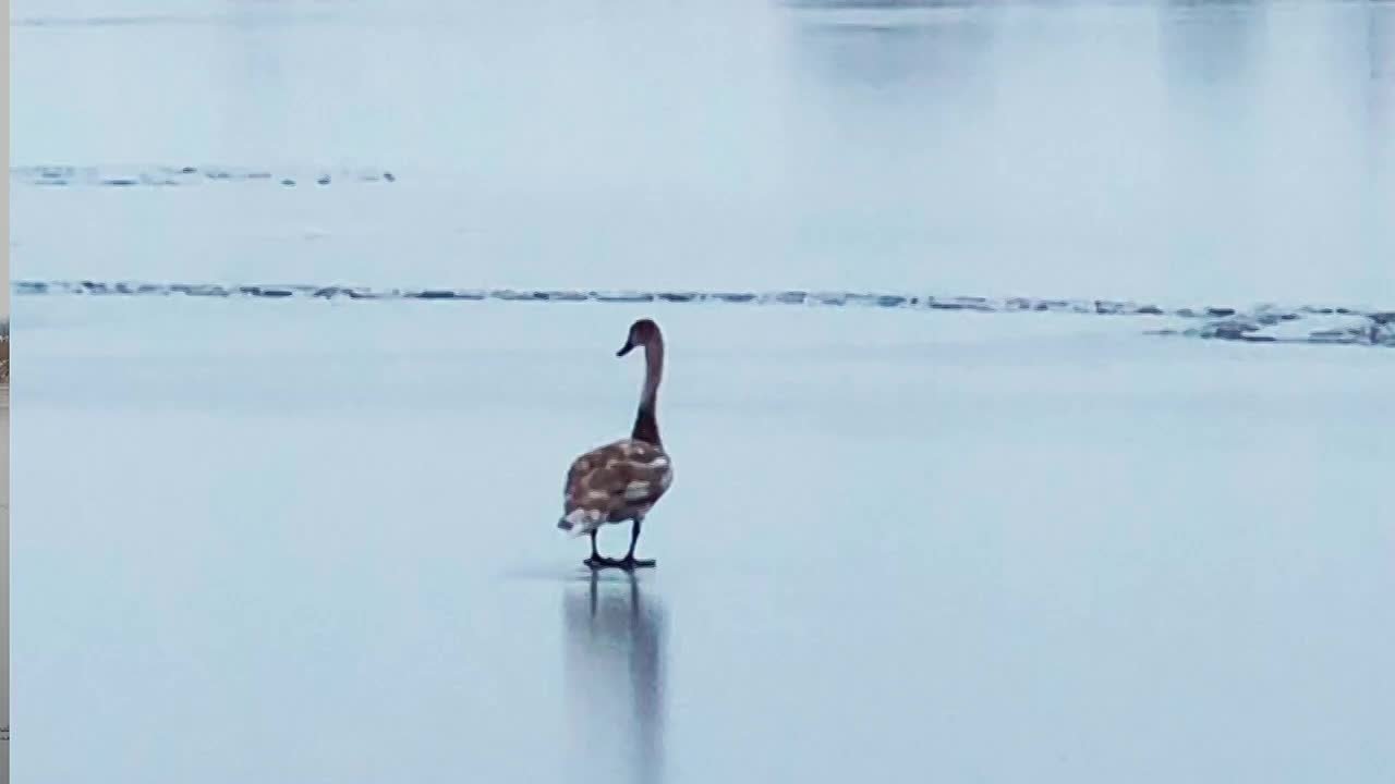 На место выехали спасатели, чтобы освободить беднягу, но оказалось, что лебедь просто отдыхал или кормился на краю полыньи в стороне от других птиц.