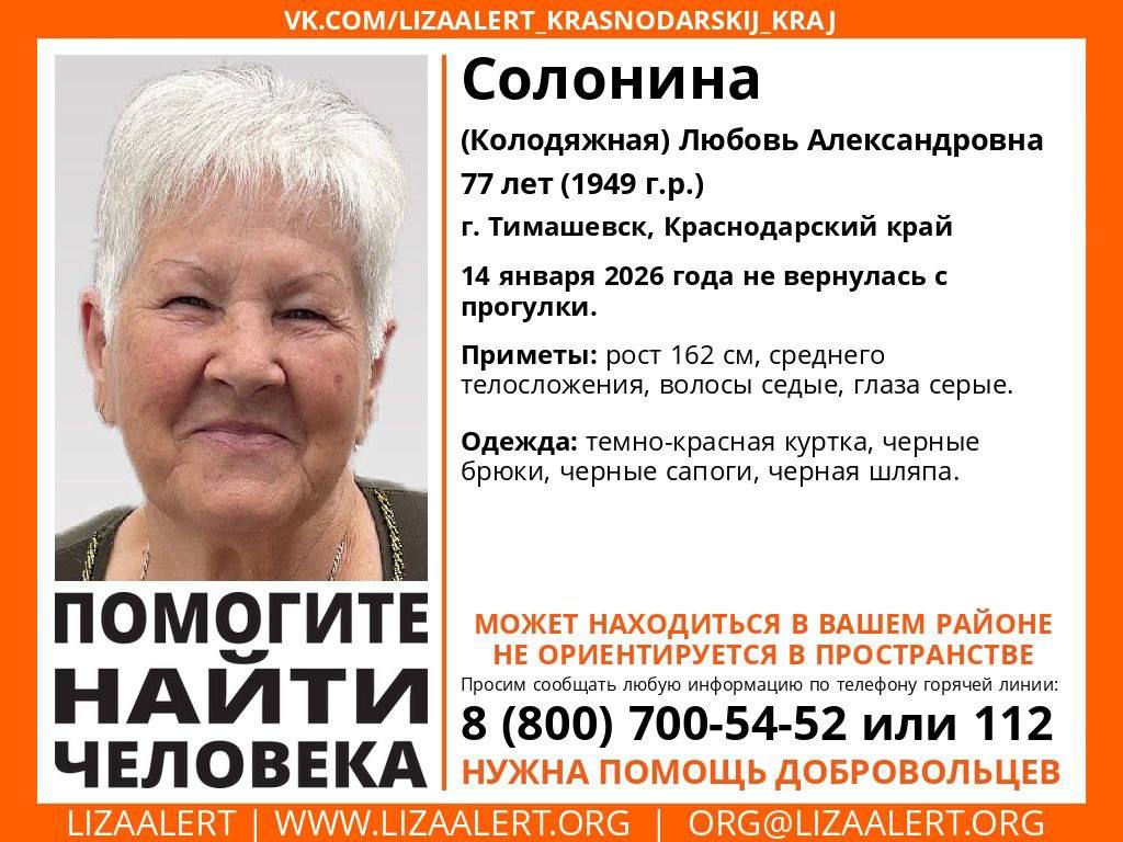 77-летняя Любовь Солонина на вернулась с прогулки 14 января. Женщина нуждается в медицинской помощи.