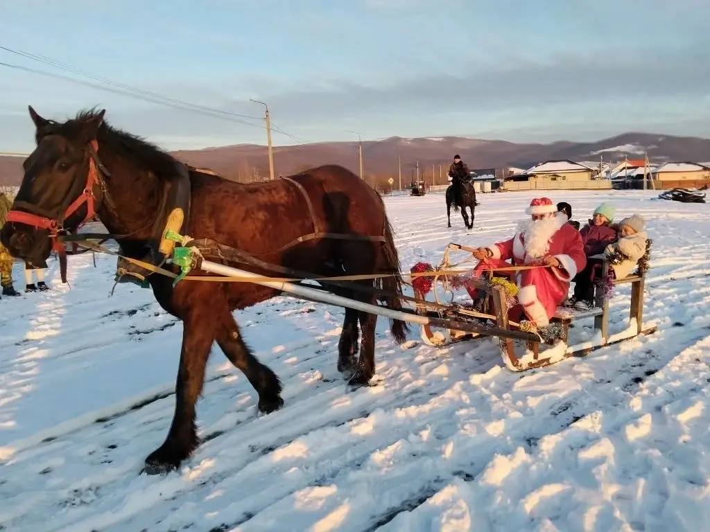 По инициативе атамана казачьего округа для детворы в хуторе Семигорском организовали незабываемое развлечение: катание на санях Деда Мороза, запряженных лошадью – символом наступившего 2026 года.