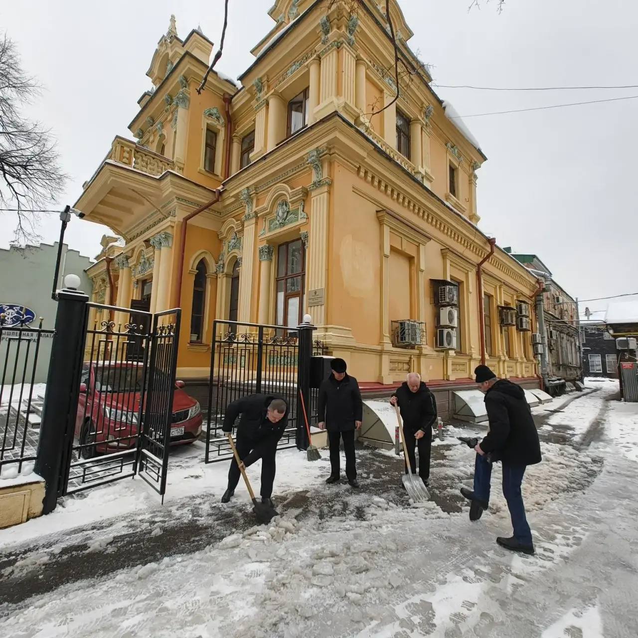 Сотрудники аппарата Общественной палаты дружно вышли на уборку снега и льда вокруг усадьбы купца Василия Рубежанского. Здание является объектом культурного наследия.