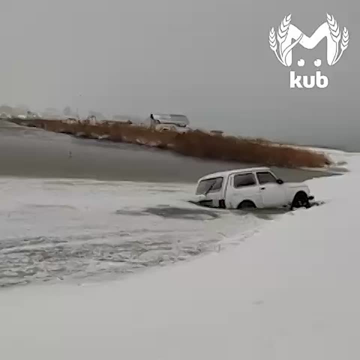 Тонкая корочка покрыла косу, но водителя это не остановило и он всё равно туда зачем-то выехал.