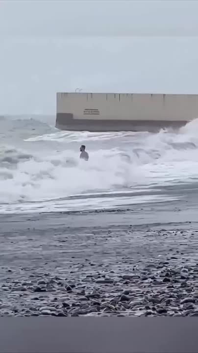 В Сочи снег и шторм? Пустяки! Нашёлся герой, который решил устроить заплыв в море.
