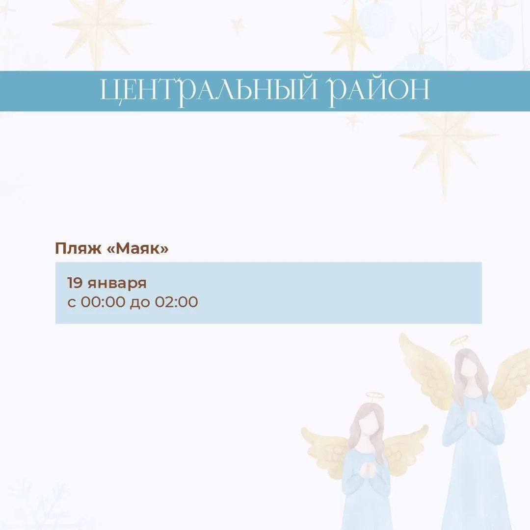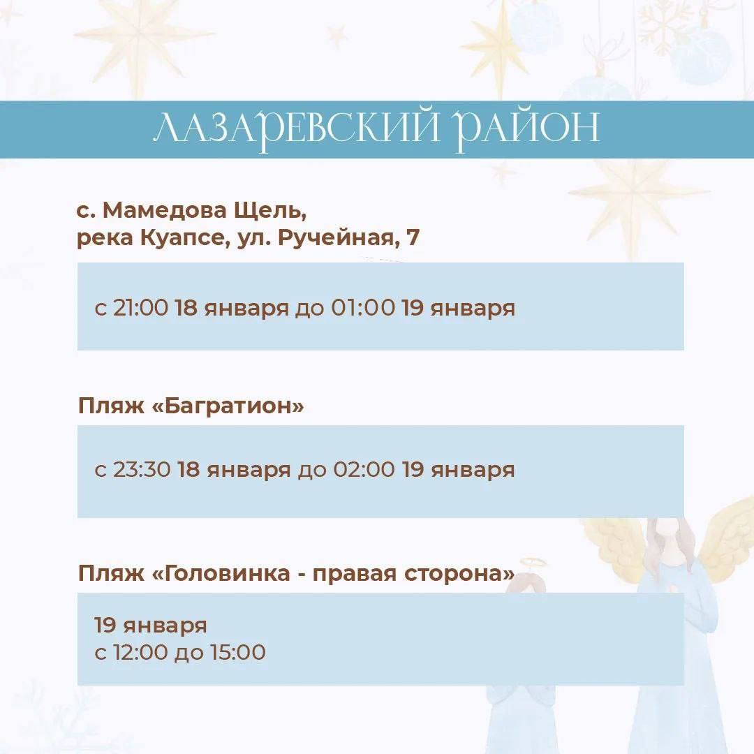 Пройти обряд омовения жители и гости Сочи смогут во всех четырех районах курорта. Для Крещенских купаний определены 10 официальных мест для дневных и ночных купаний. Они состоятся при благоприятных погодных условиях 18 и 19 января.