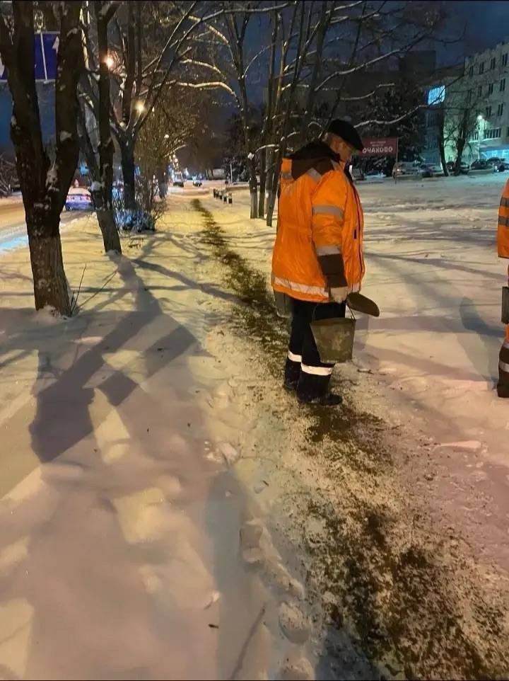 Сотрудники коммунальных служб продолжают обрабатывать пешеходные зоны песко-соляной смесью
