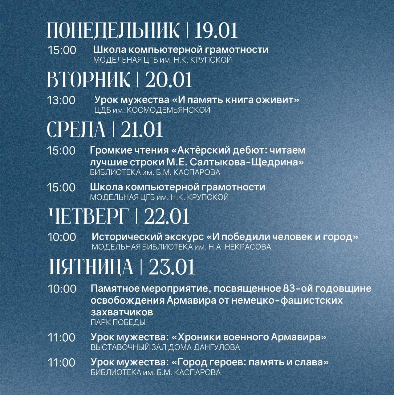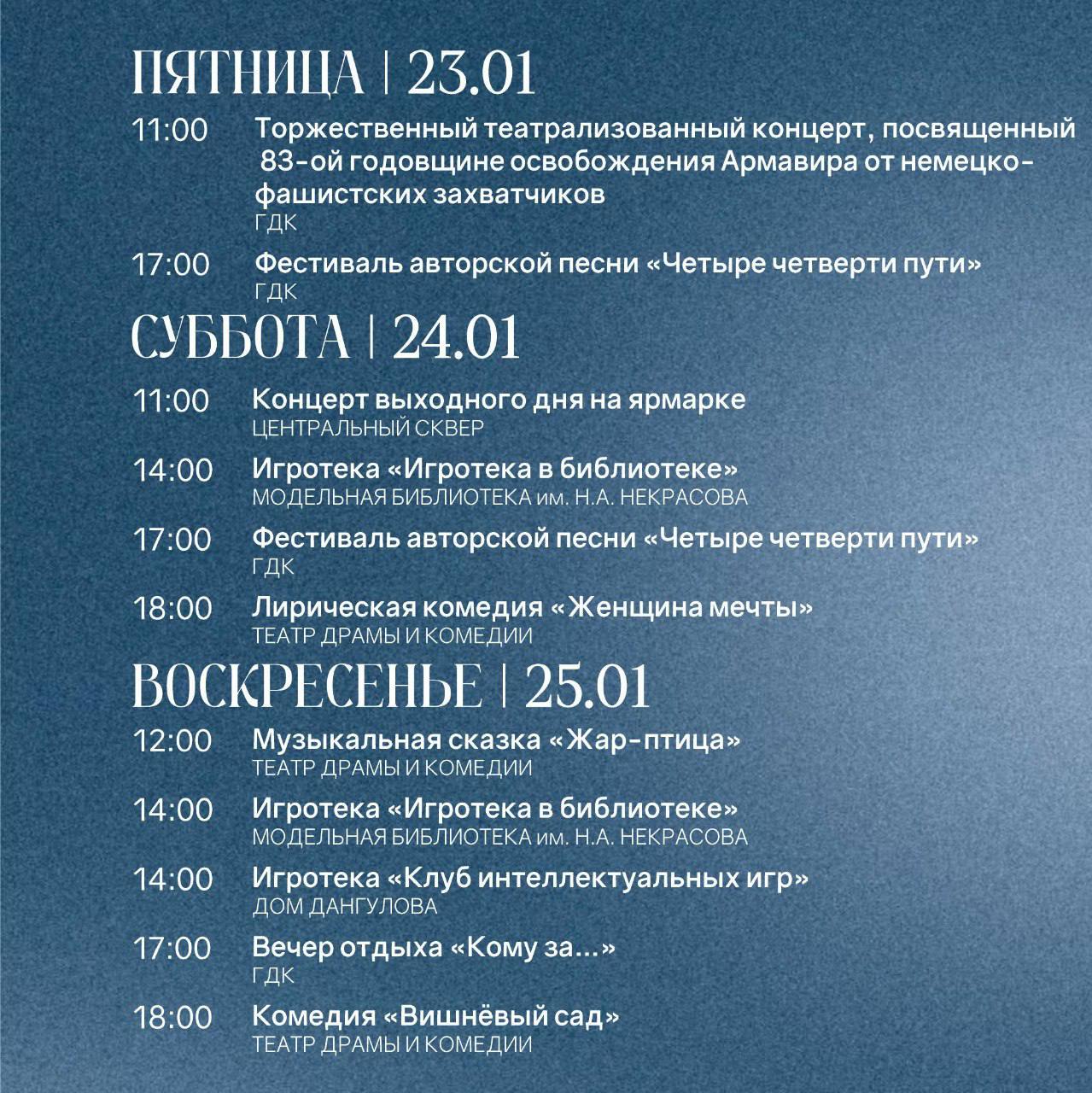 Вас ждут тематические мероприятия в библиотеках, концерты, игротеки и другие увлекательные события. Не забываем и про яркие спектакли Армавирского театра драмы и комедии: эти выходные будут поистине занимательными!