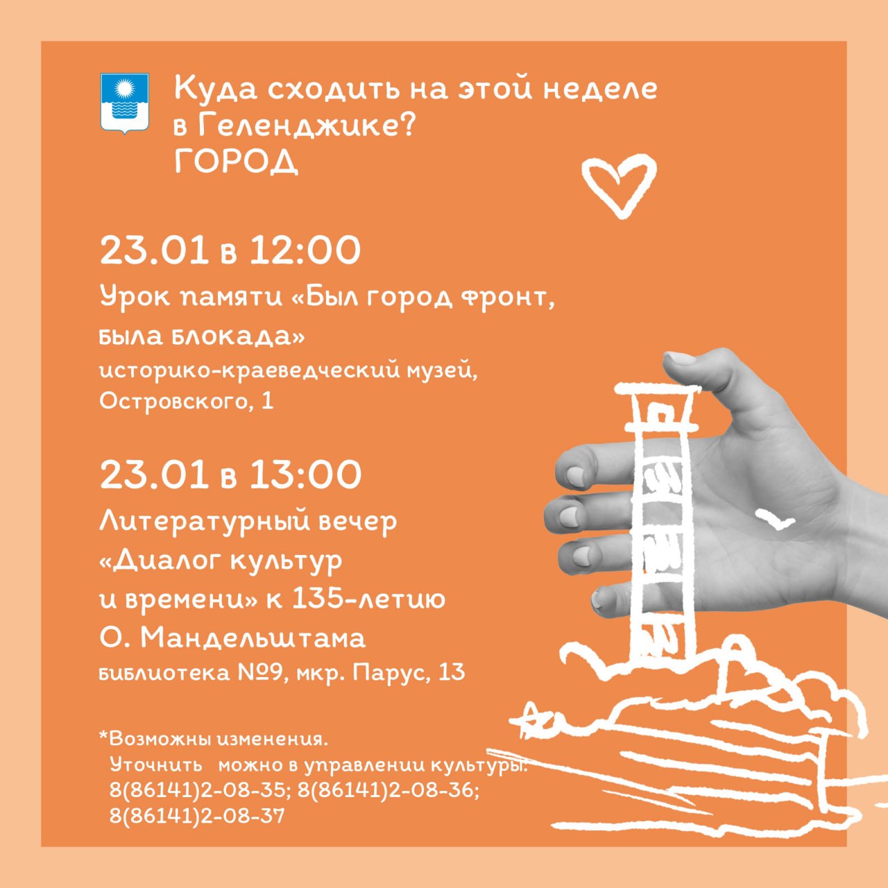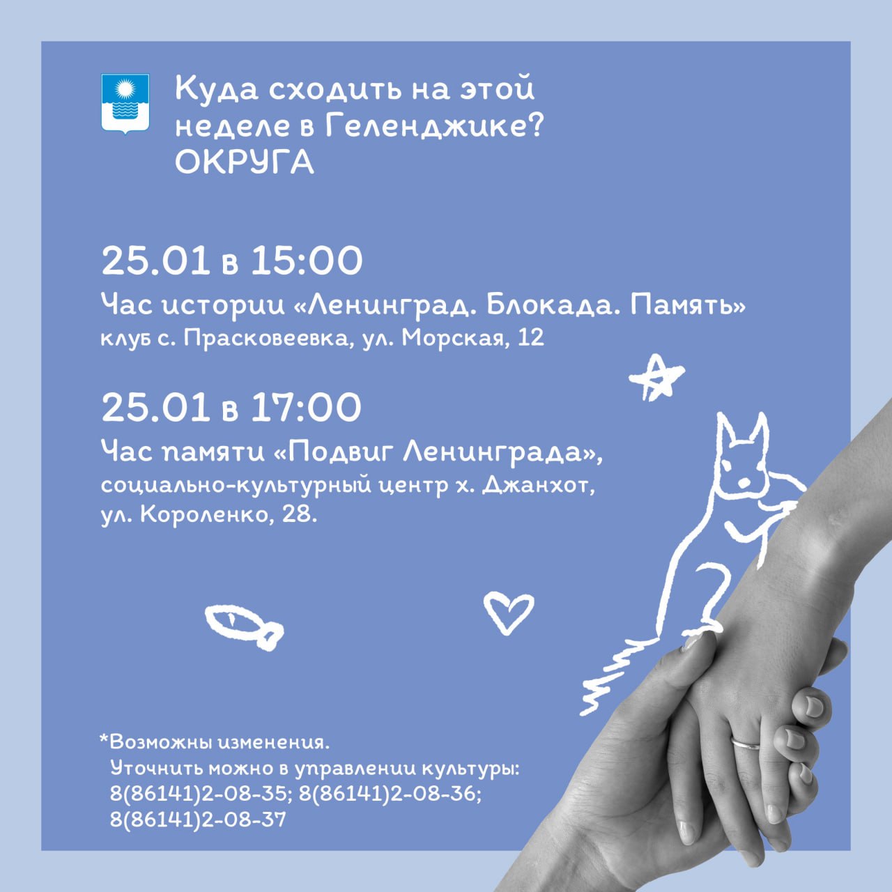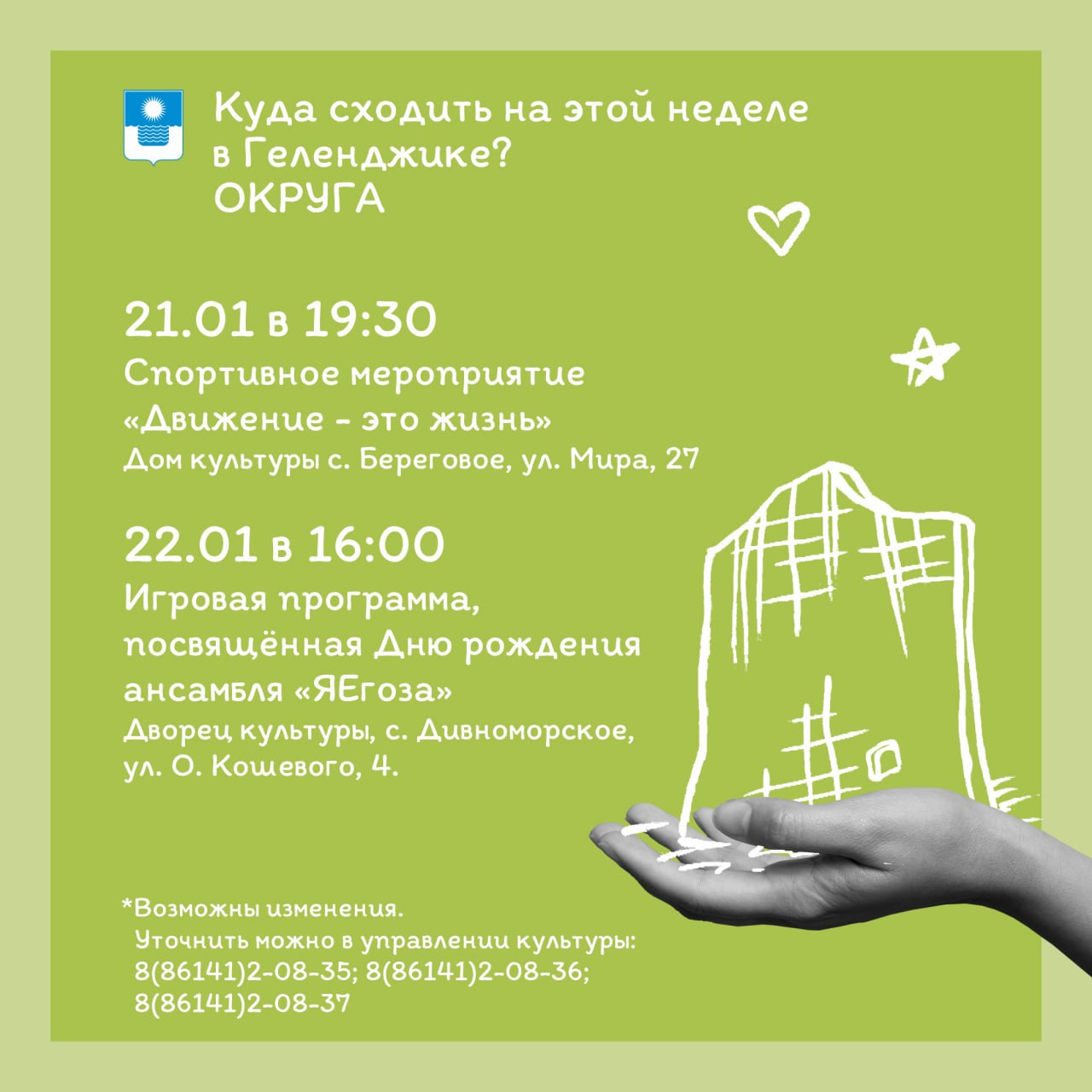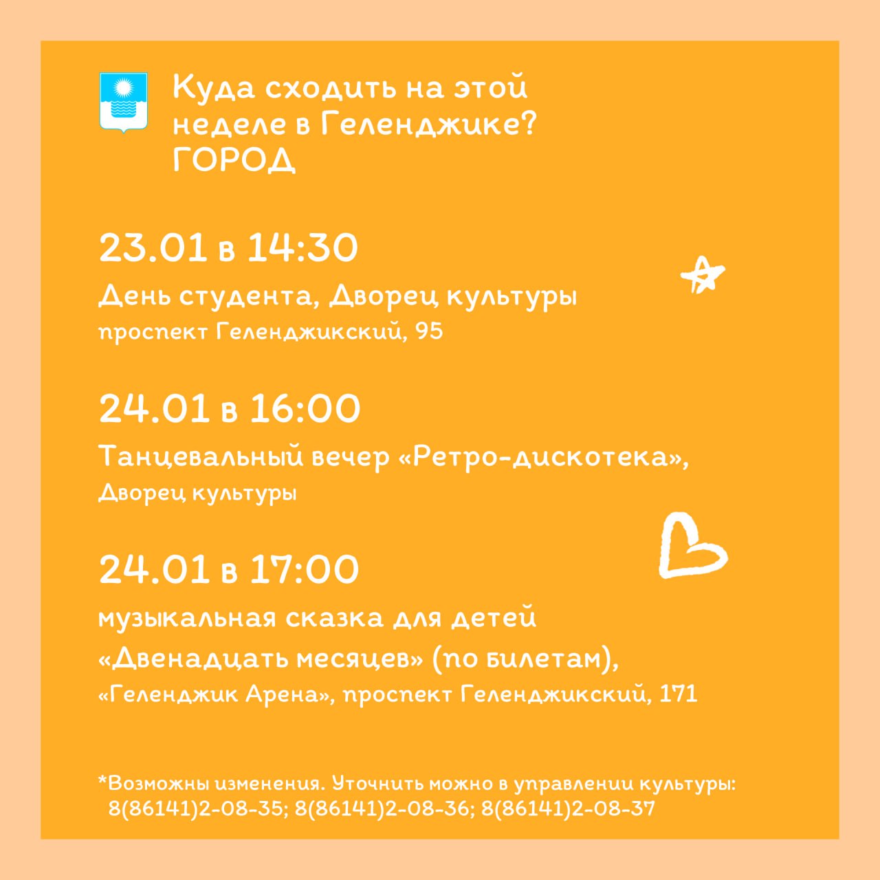 Внимание! Возможны временные изменения или отмены. По уточняющим вопросам обращаться по телефонам: 8(86141)2-08-35; 8(86141)2-08-36; 8(86141)2-08-37 (управление культуры, искусства и кинематографии).