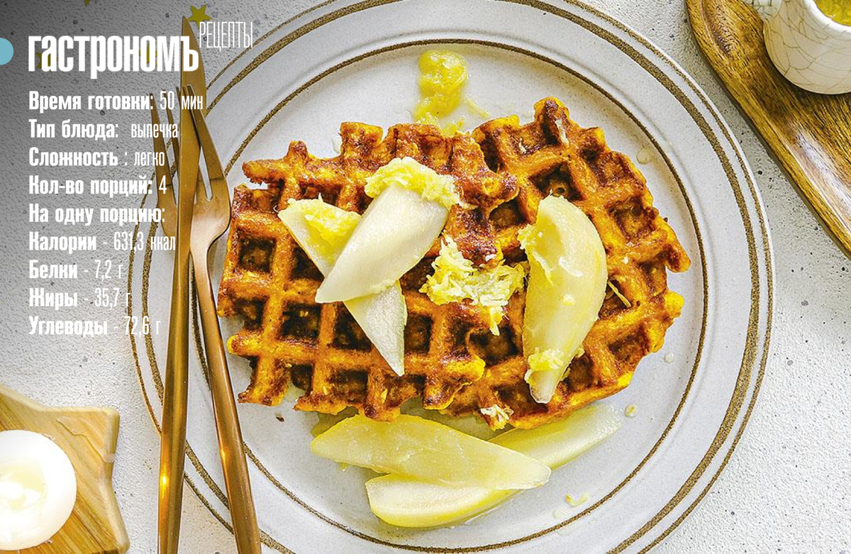 Морковь натирается на мелкой терке и добавляется в тесто, после чего вафли выпекаются до золотистого цвета и подаются с грушами, политыми имбирным сиропом.
