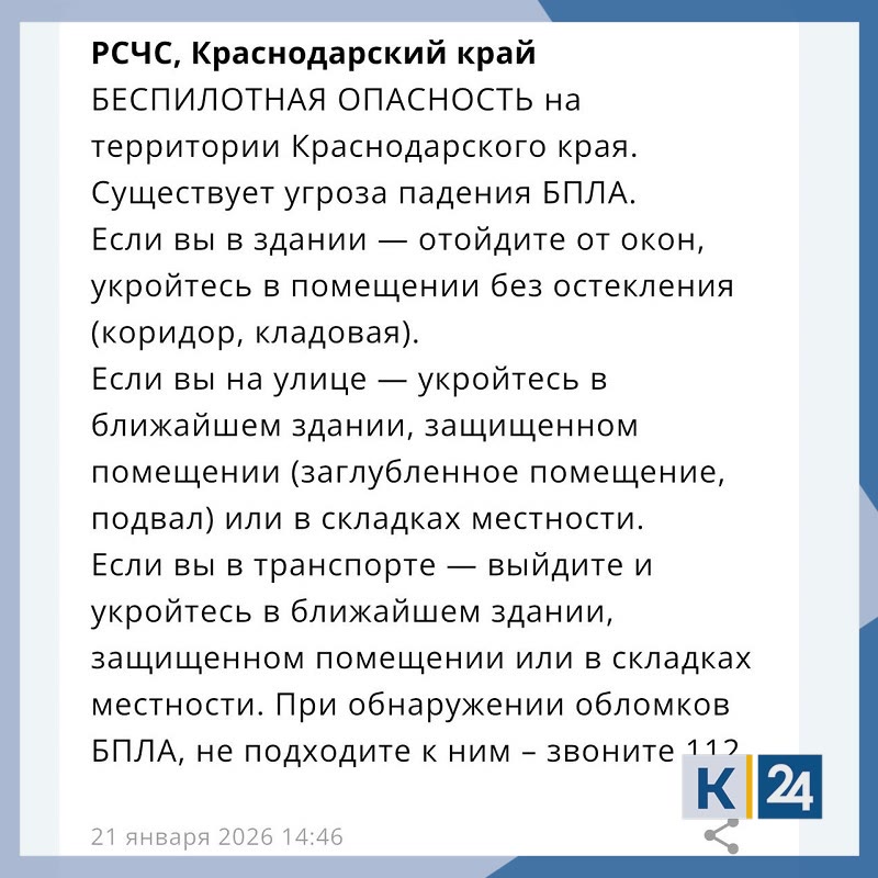 Сохраняйте спокойствие, укройтесь в безопасном месте.Другие районы, перекличка в комментариях.Уважаемые жители и гости федеральной территории «Сириус»! Существует угроза атаки БПЛА. Все силы и средства готовы к ее...