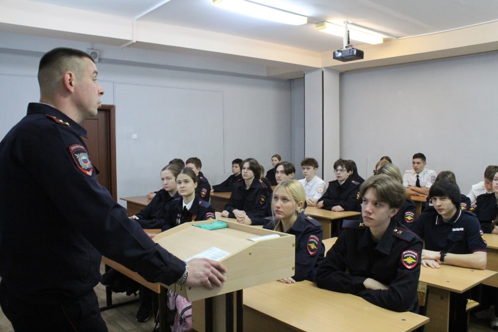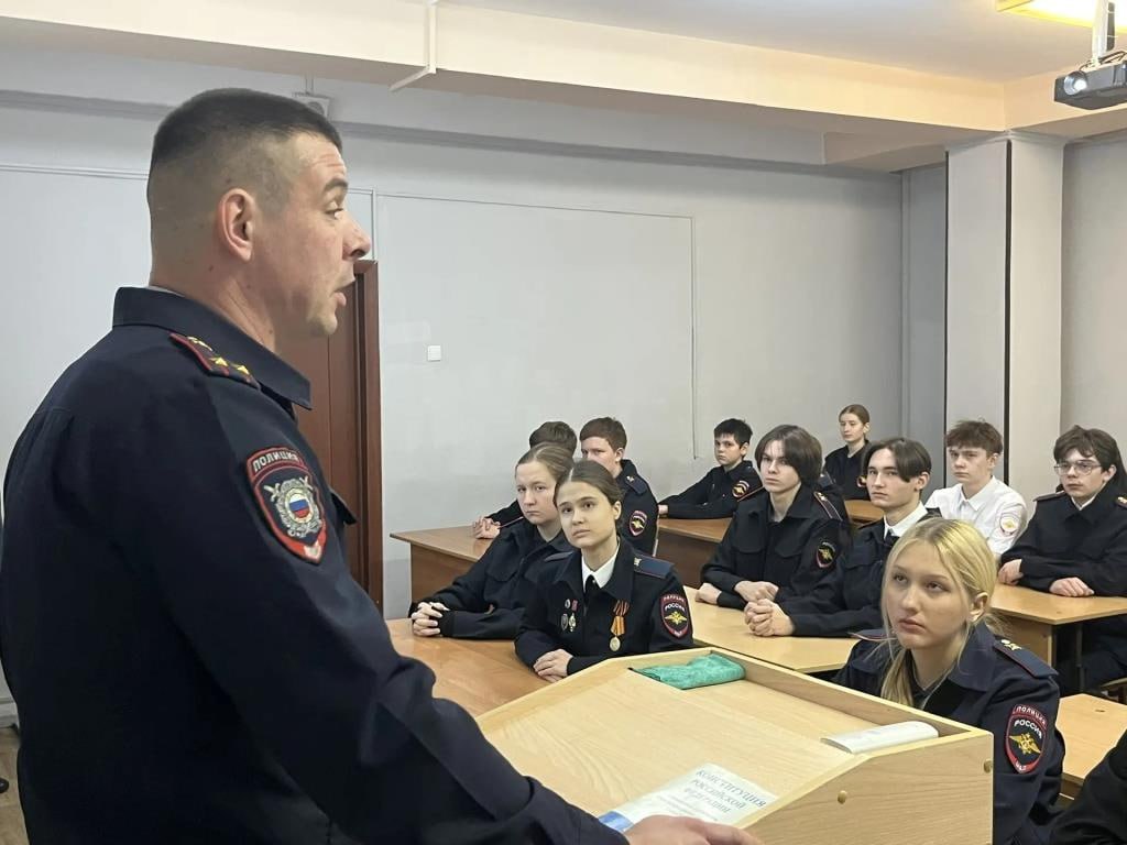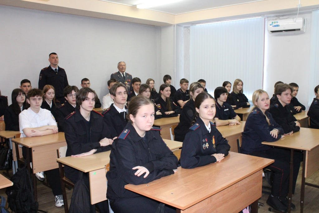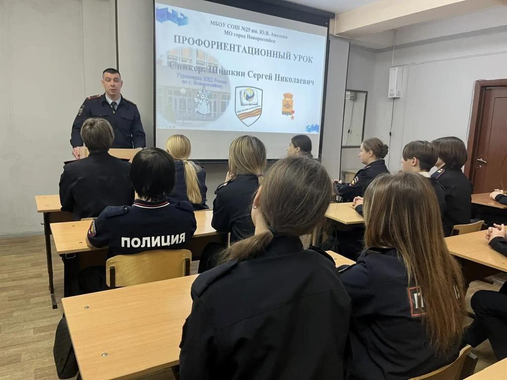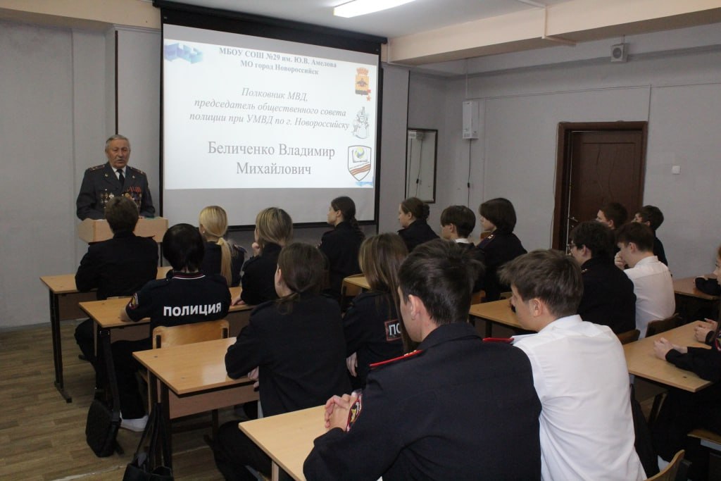 С учениками профильных полицейских классов школы № 29 им. Ю.В. Амелова встретился старший специалист отделения профессиональной подготовки отдела по работе с личным составом Управления МВД России по городу Новороссийску подполковник полиции Сергей Николаевич Шишкин и ветеран МВД, председатель Общественного совета при ведомстве полковник милиции в отставке Владимир Михайлович Беличенко.