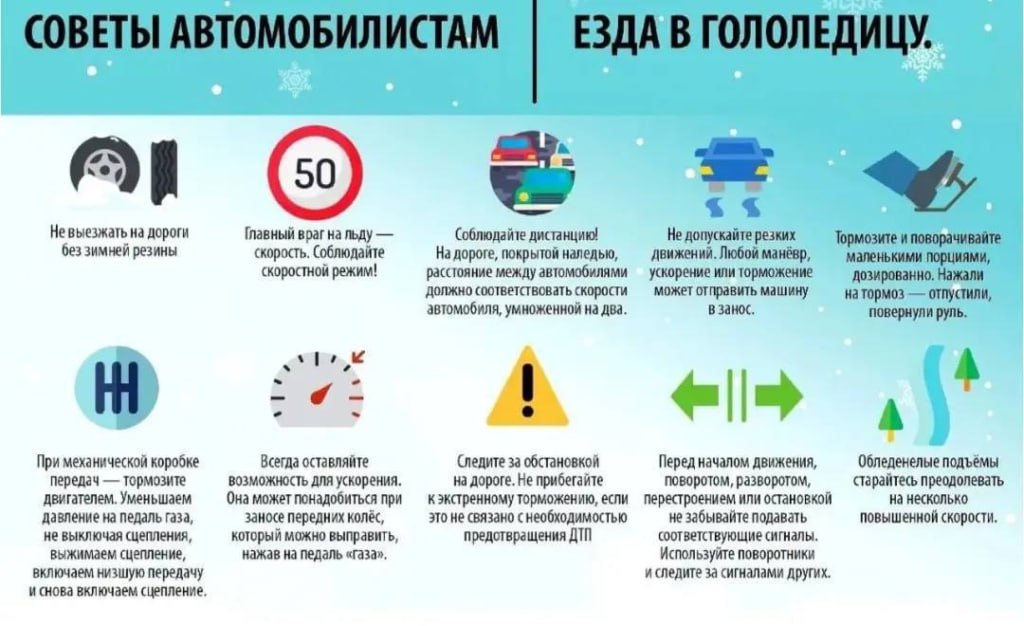 Уважаемые водители! Во время гололедицы помните, что тормозной путь на скользкой дороге значительно увеличивается. Поэтому: