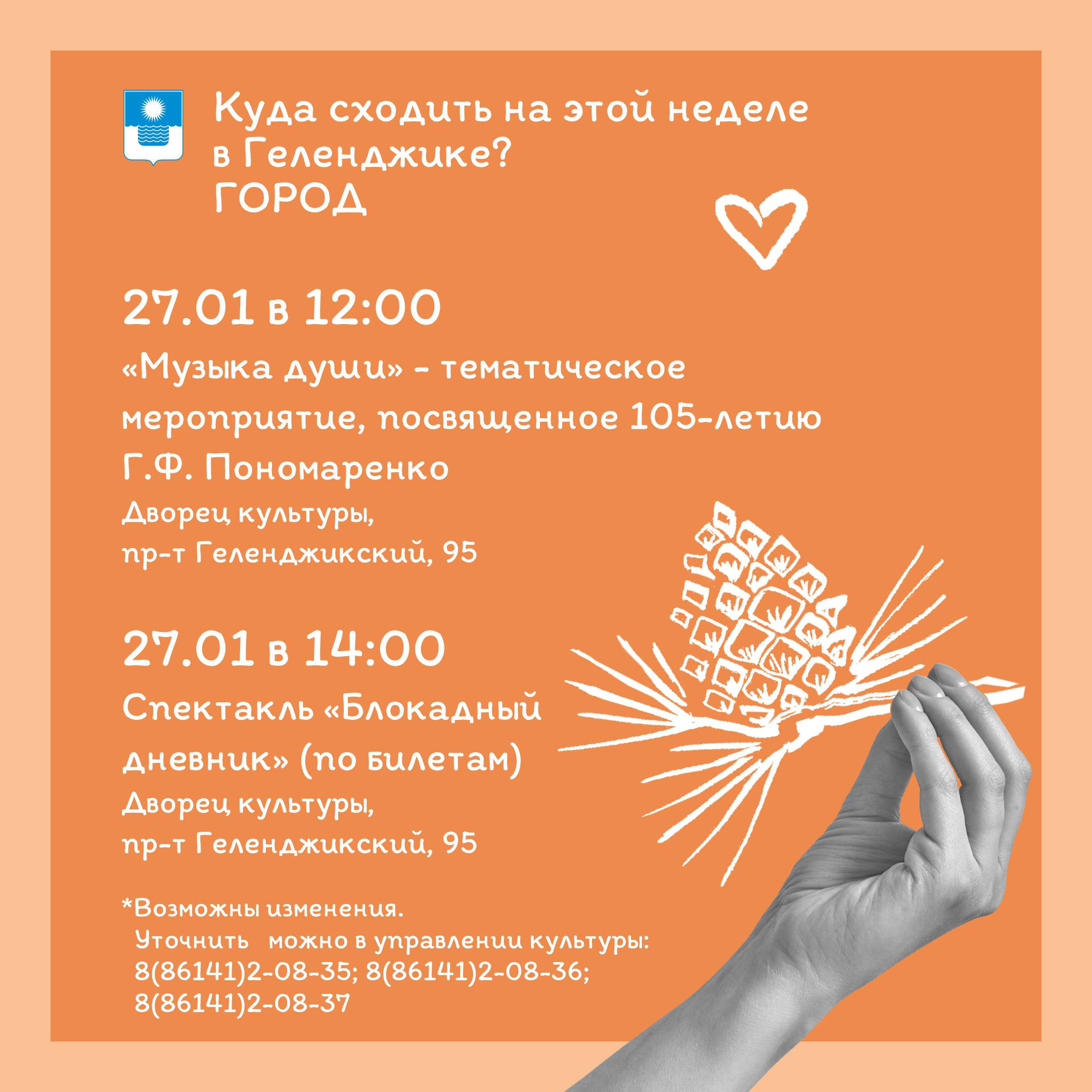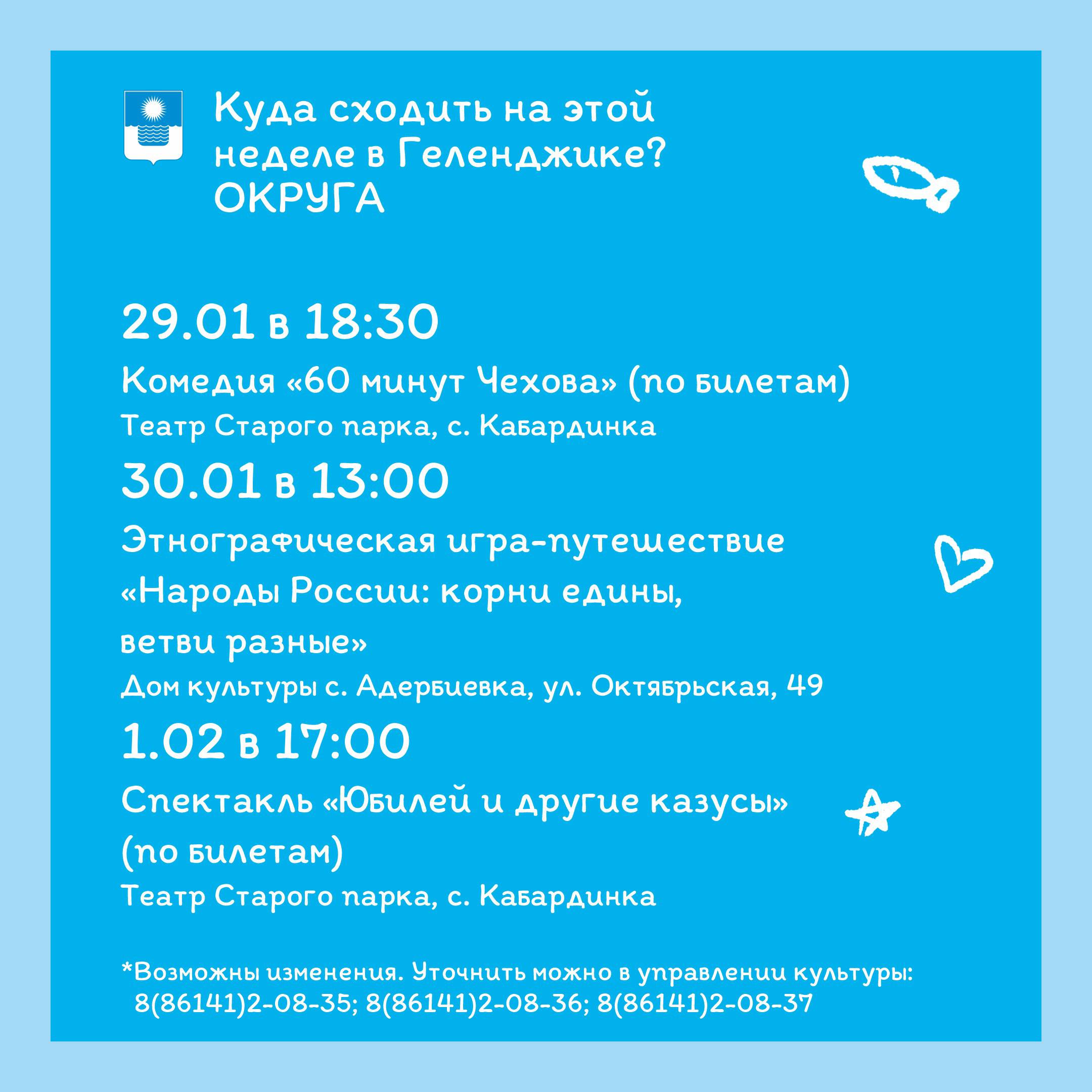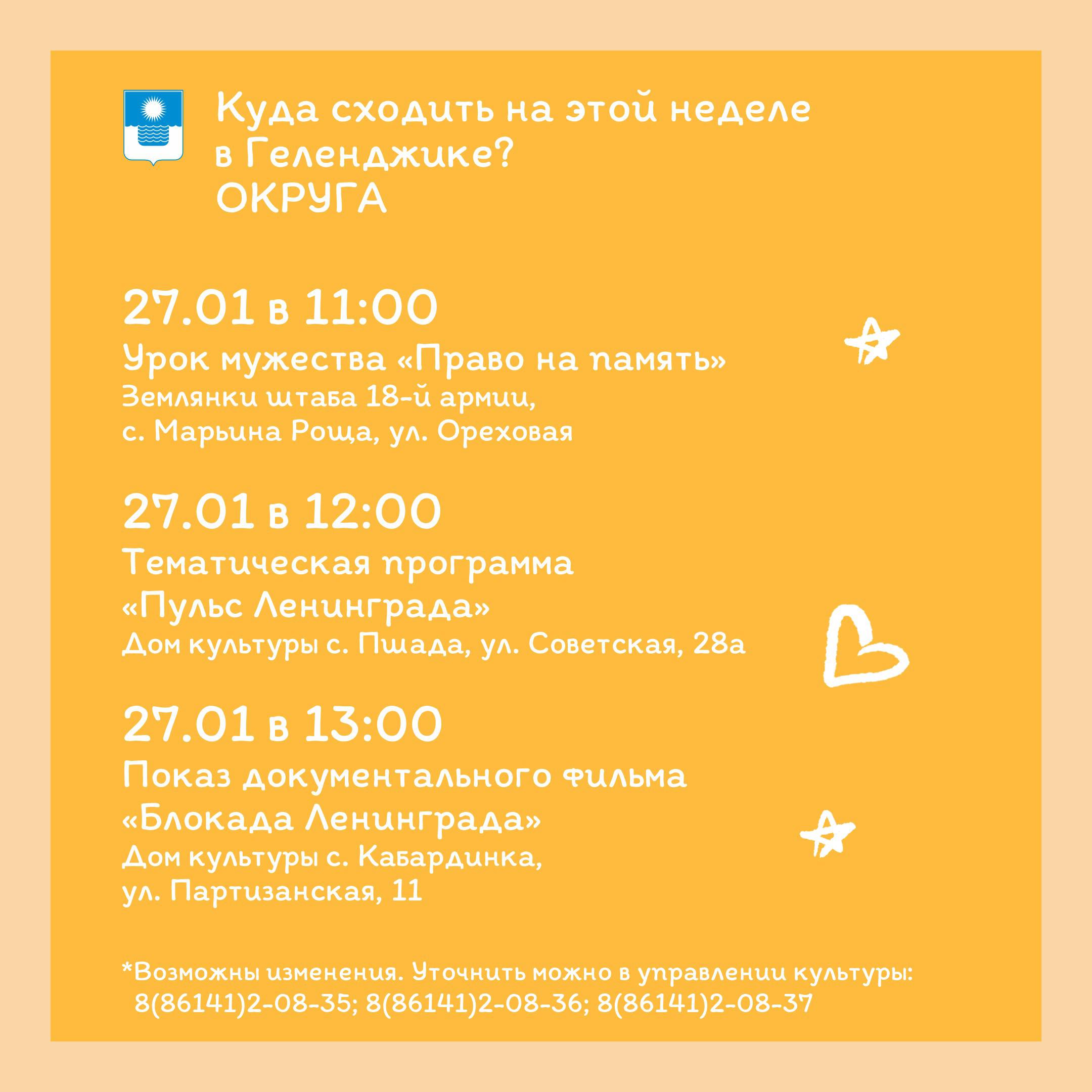 С 26 января по 1 февраля в учреждениях культуры Большого Геленджика пройдут различные мероприятия. Подробнее - на карточках.
