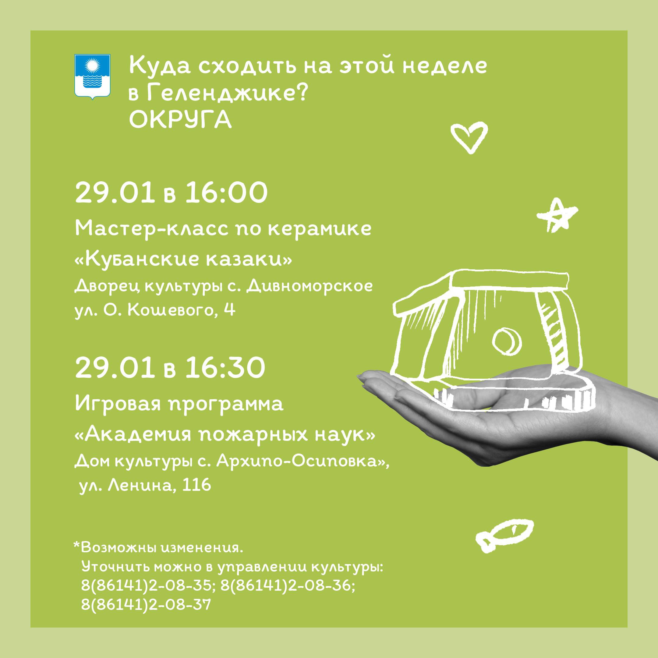 Внимание! Возможны временные изменения или отмены. По уточняющим вопросам обращаться по телефонам: 8(86141)2-08-35; 8(86141)2-08-36; 8(86141)2-08-37 (управление культуры, искусства и кинематографии).