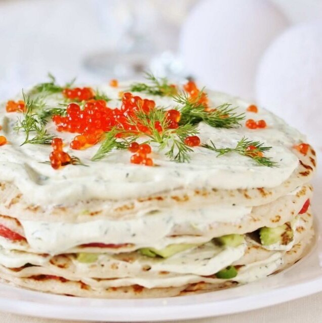 После ждёт достаточно простая сборка: каждый блин становится подложкой для крем-сырно-сметанного крема, а сверху — слоями рыба, авокадо и зелень, сбрызнутые лимонным соком.