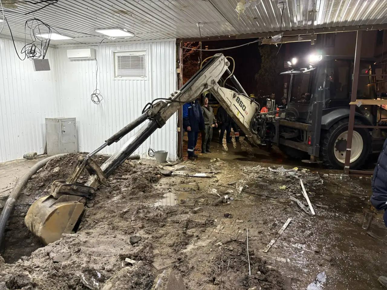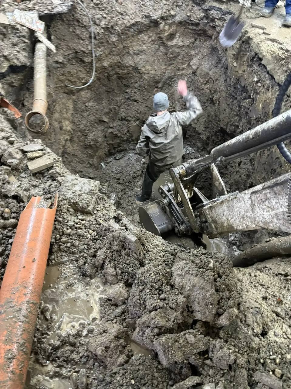 Специалисты всю ночь работали на аварийном участке. Часть торгового павильона, который стоит над местом прорыва, пришлось демонтировать. Участок трубы срезали для последующей замены.