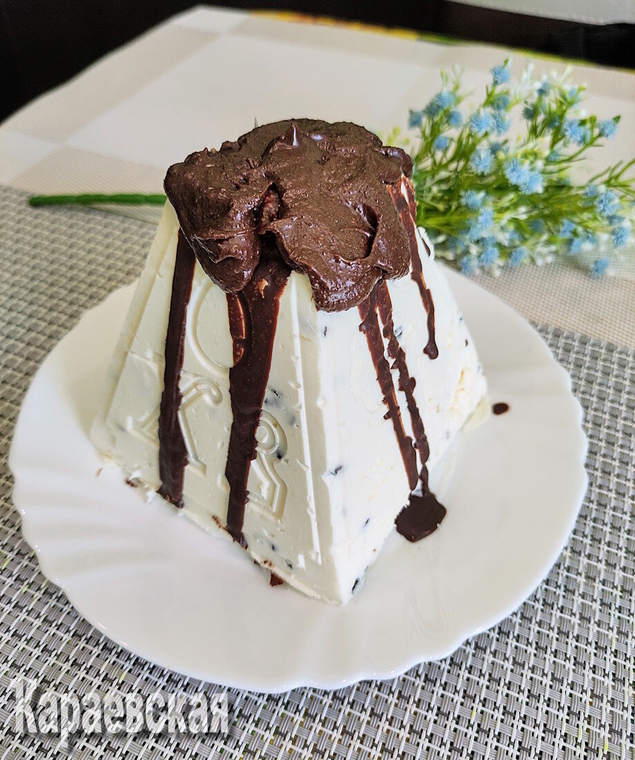 Для массы берут творог 9%, сметану 25%, сливки и немного ванилина, чтобы подчеркнуть мягкость вкуса. Смешали до однородности, добавили какао крупку или тертое какао и кремовую массу охладили в форме для пасхи не менее чем на два с половиной часа. Выложенная масса держится крепко и не расплывается, что удобно для сервировки в праздничный день.