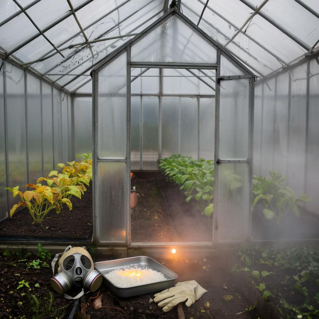 Герметичность теплицы — ключевой фактор. Все щели закрывают, форточки и двери уходят под плотное закрытие, чтобы предотвратить утечку газа. Почву и внутренние поверхности слегка увлажняют для лучшего растворения газа и усиления дезинфицирующего эффекта.