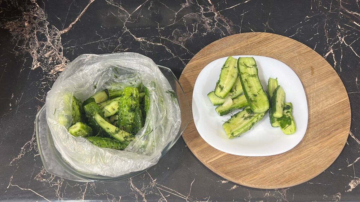 Этот вариант проще обычного рецепта: огурцы моют, разрезают на удобные части и отправляют в пакет вместе с солью, сахаром и перцем. Всё это аккуратно перемешивают, а затем оставляют охлаждаться. Времени уходит немного, но ощущение свежей заготовки остаётся надолго.