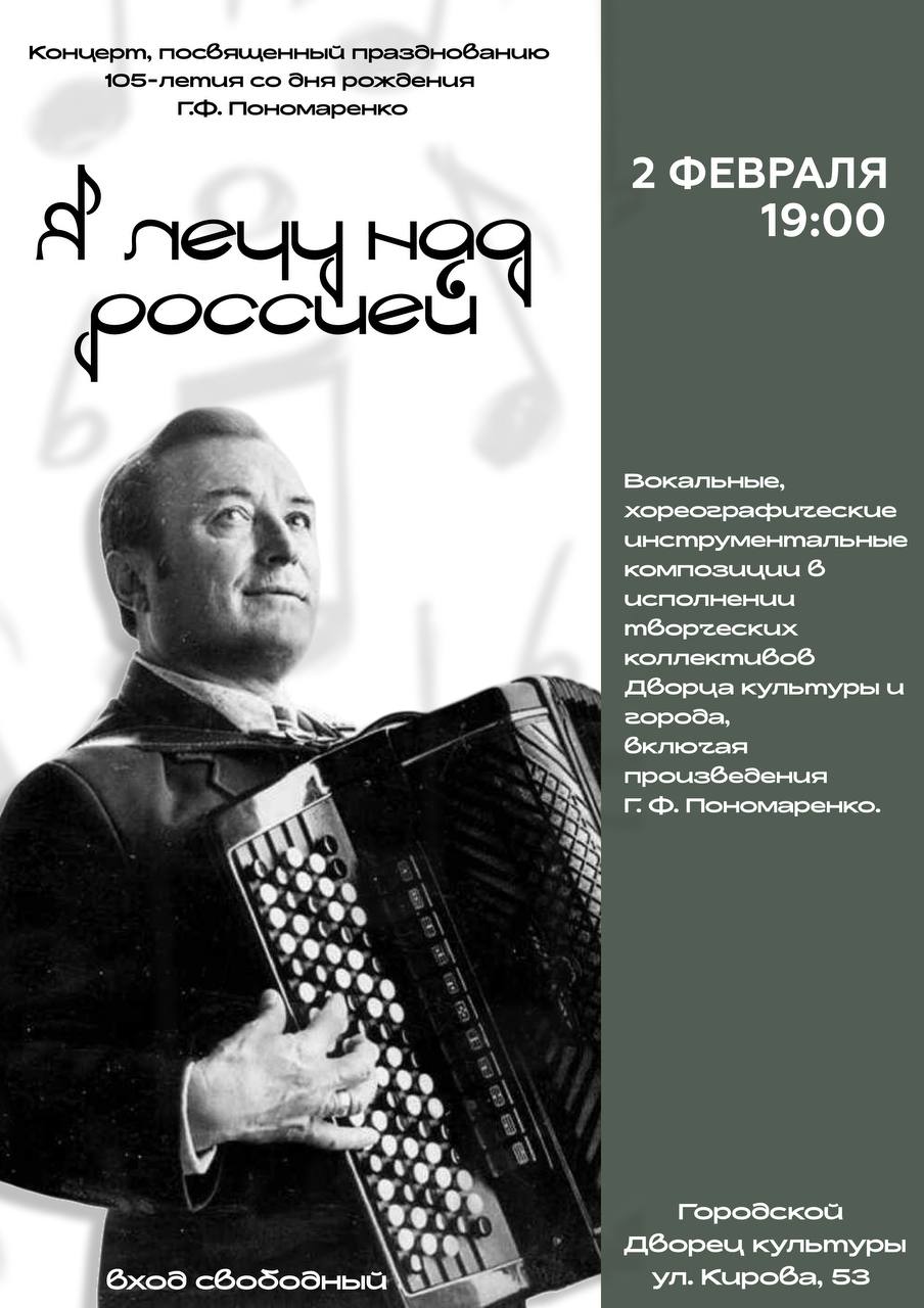 Уважаемые гости и жители нашего города! Мы приглашаем вас на большой праздничный концерт, посвященный 105-летию со дня рождения великого русского композитора Григория Федоровича Пономаренко.