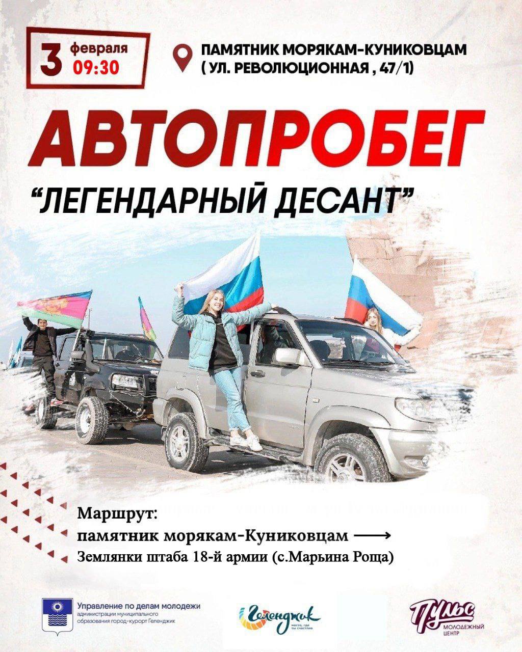 В честь празднования годовщины высадки легендарного десанта под командованием майора Цезаря Львовича Куникова приглашаем принять участие в АВТОПРОБЕГЕ всех желающих на личном автомобиле.
