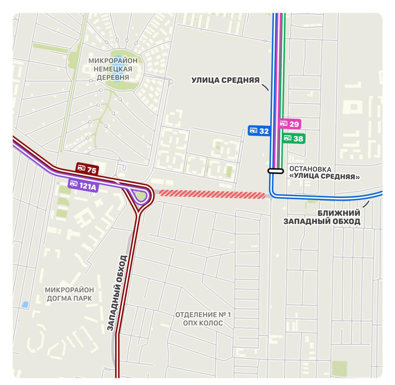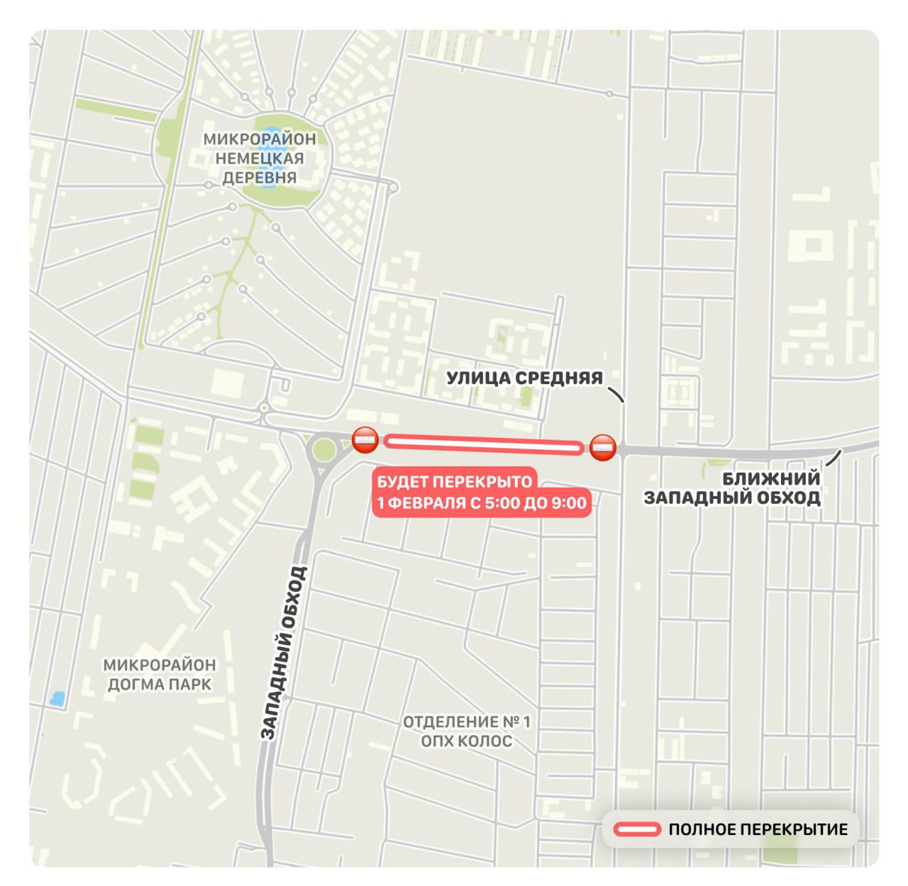 1 февраля с 05:00 до 09:00 движение транспорта и пешеходов по Ближнему Западному обходу перекроют на участке от кольца «Немецкой Деревни» до улицы Средней.