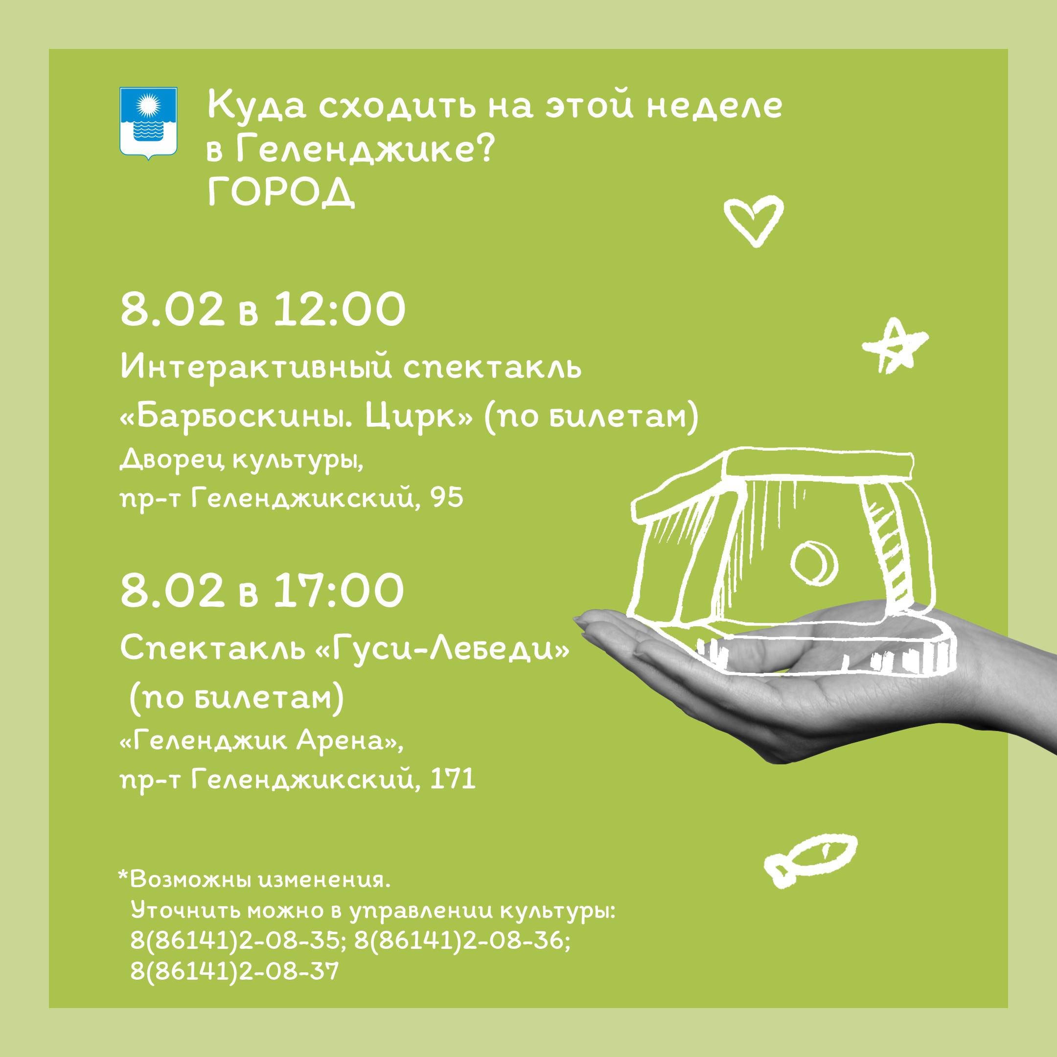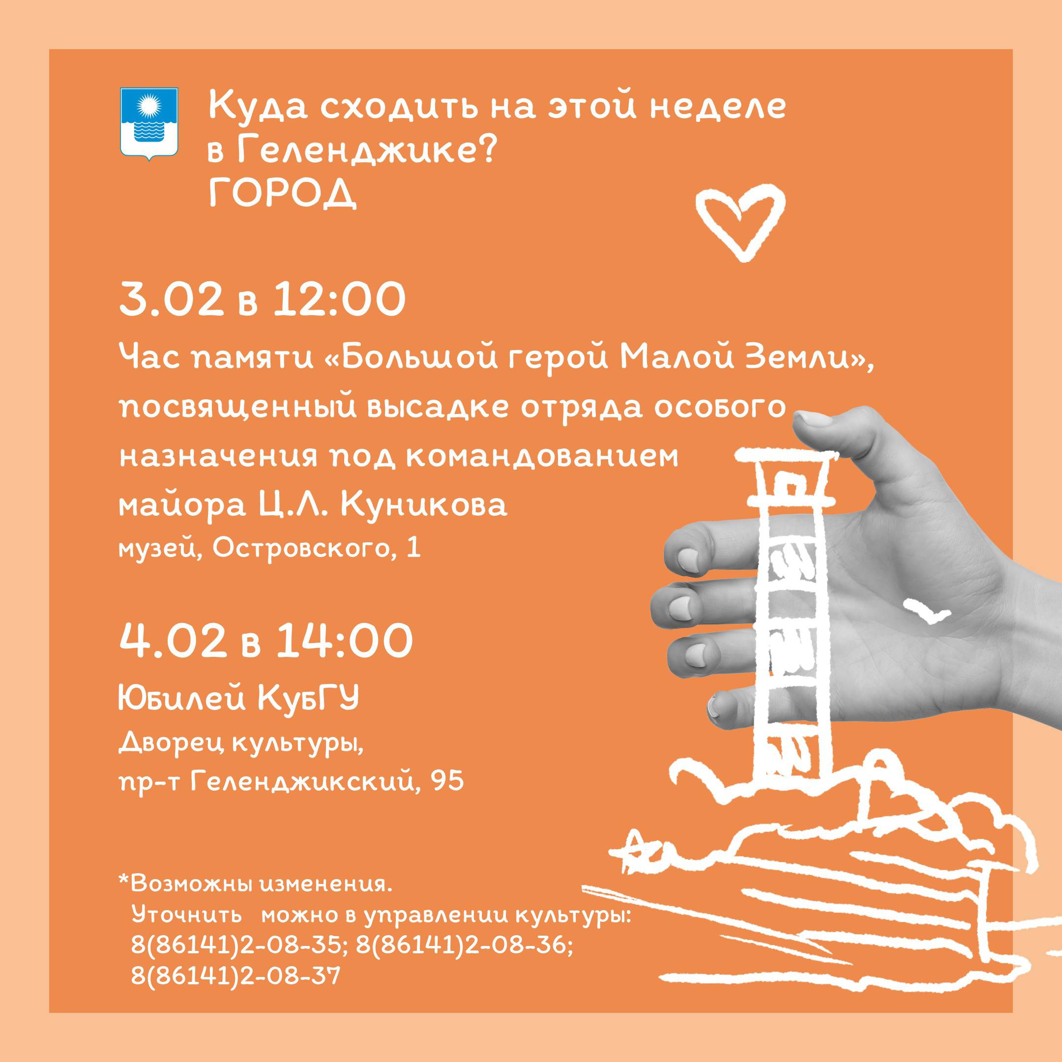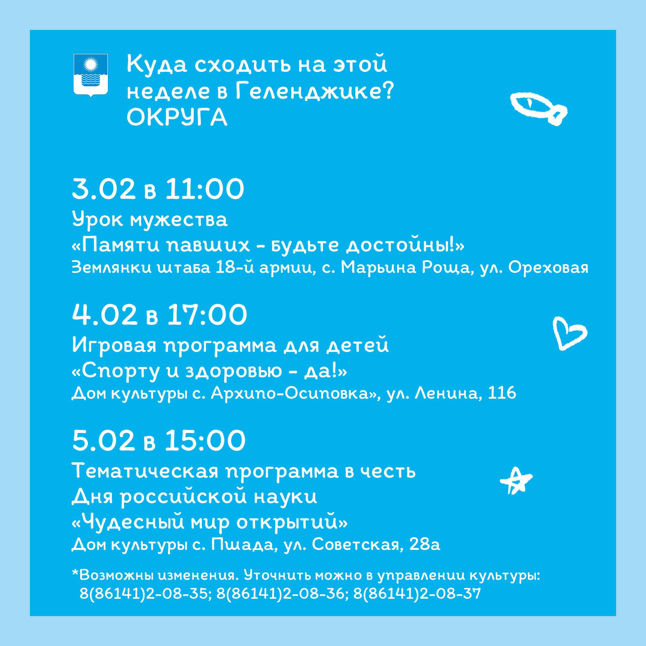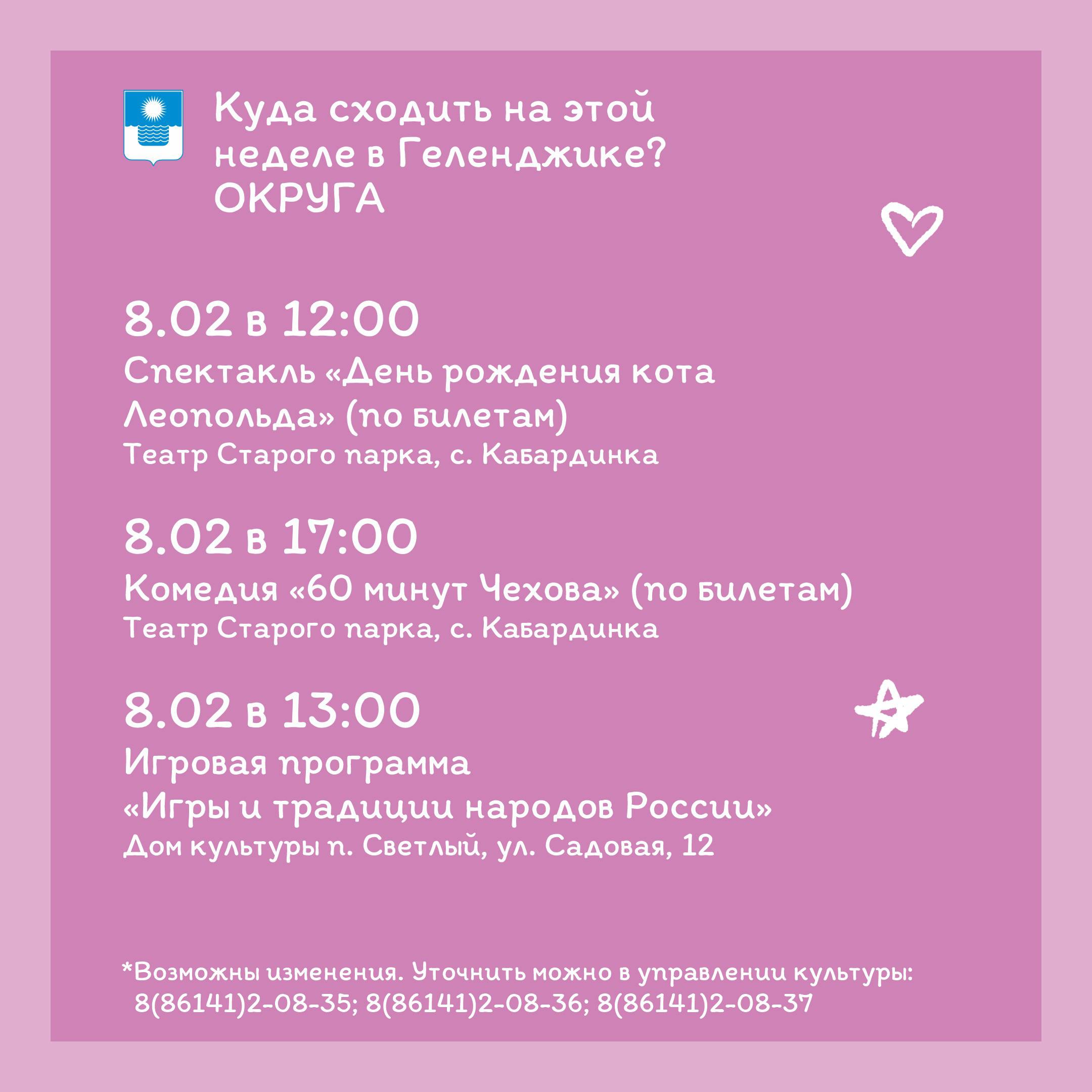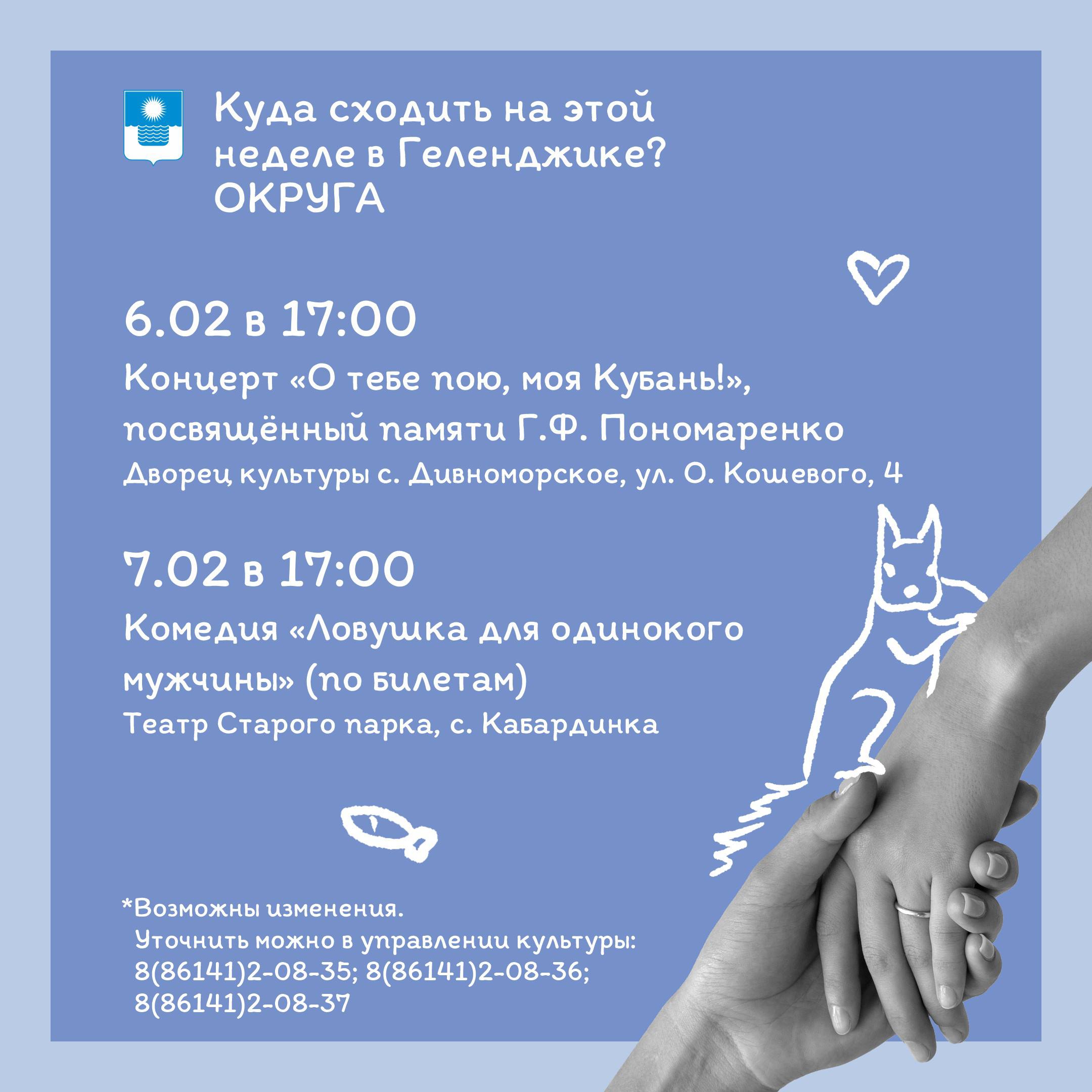 С 3 по 8 февраля в учреждениях культуры Большого Геленджика пройдут различные мероприятия. Подробнее - на карточках.