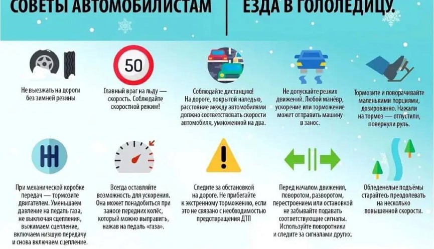 Уважаемые водители! Во время гололедицы помните, что тормозной путь на скользкой дороге значительно увеличивается. Поэтому: