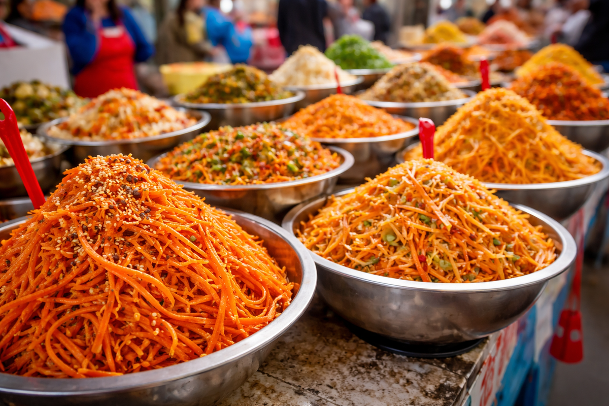 Пока в столовых угощали несладкой тертой морковью, на рынках под другой соус уже происходила другая история. После депортации корейцев в 1937 году они адаптировали свои традиции к новому окружению. Замена капусты на морковь — дешевый и доступный продукт — привела к появлению нового блюда.