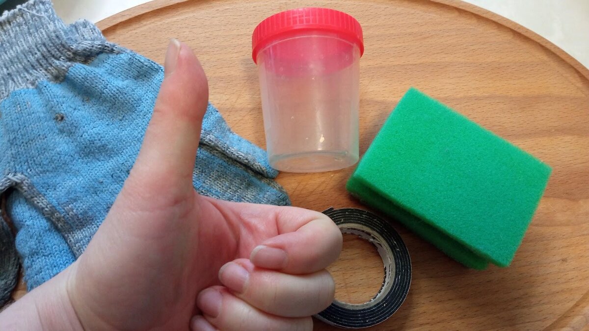 Еще одно замечательное изобретение — приспособление для мытья посуды, которое станет настоящим помощником как в домашних условиях, так и на природе. Для его создания понадобится небольшая пластиковая баночка, в которую необходимо сделать прорезы в крышке. С помощью двустороннего скотча или строительного клея к крышке прикрепляется губка для посуды.