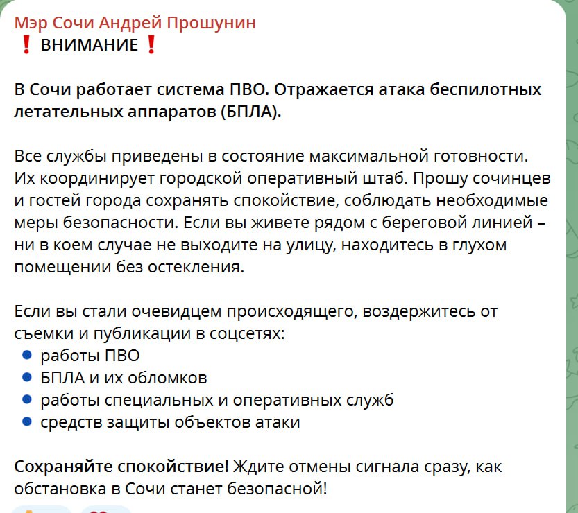 - Сочи. Мощный разрыв слышал город. Работает ПВО. К обломкам не подходить. Оставаться в укрытиях. Разлетаться может мощно. Два майора Два майора в МАХ// Два майора