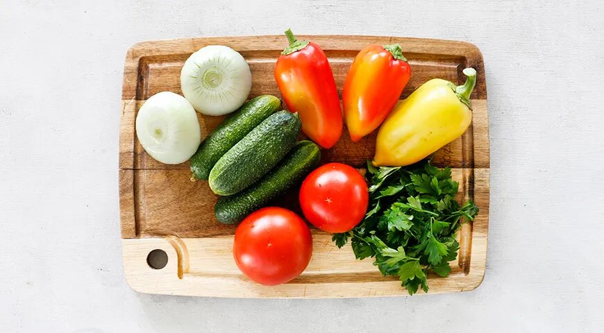 Перед началом процесса важно тщательно подготовить все ингредиенты. Необходимо вымыть помидоры, сладкий перец, огурцы и зелень петрушки, а затем обсушить их с помощью бумажного полотенца. Лук также следует очистить и промыть.