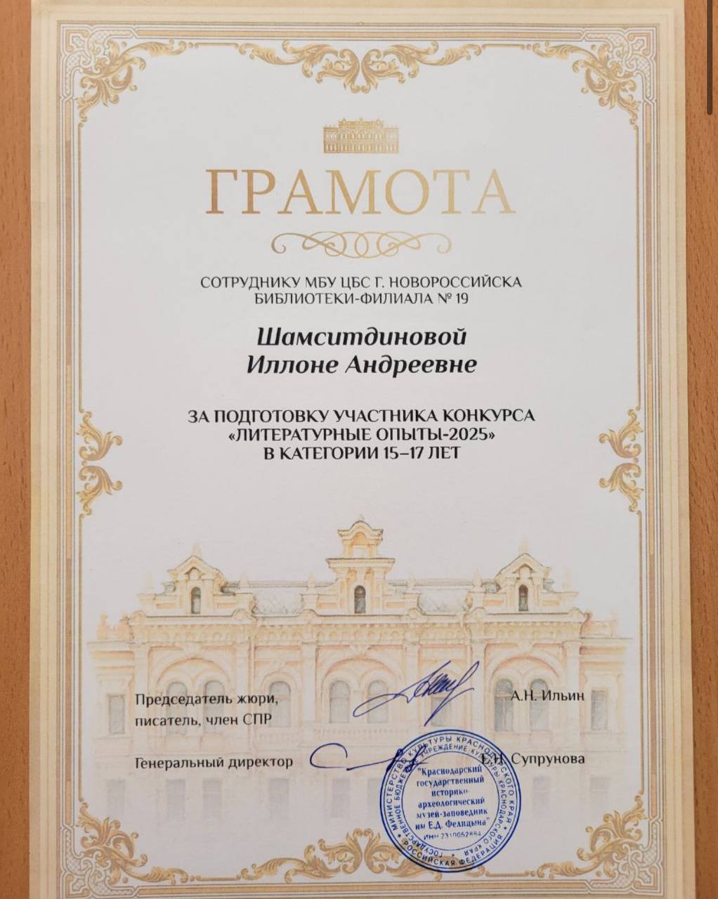 Юная читательница новороссийской библиотеки стала победительницей всероссийского конкурса рассказов «Литературные опыты – 2025»