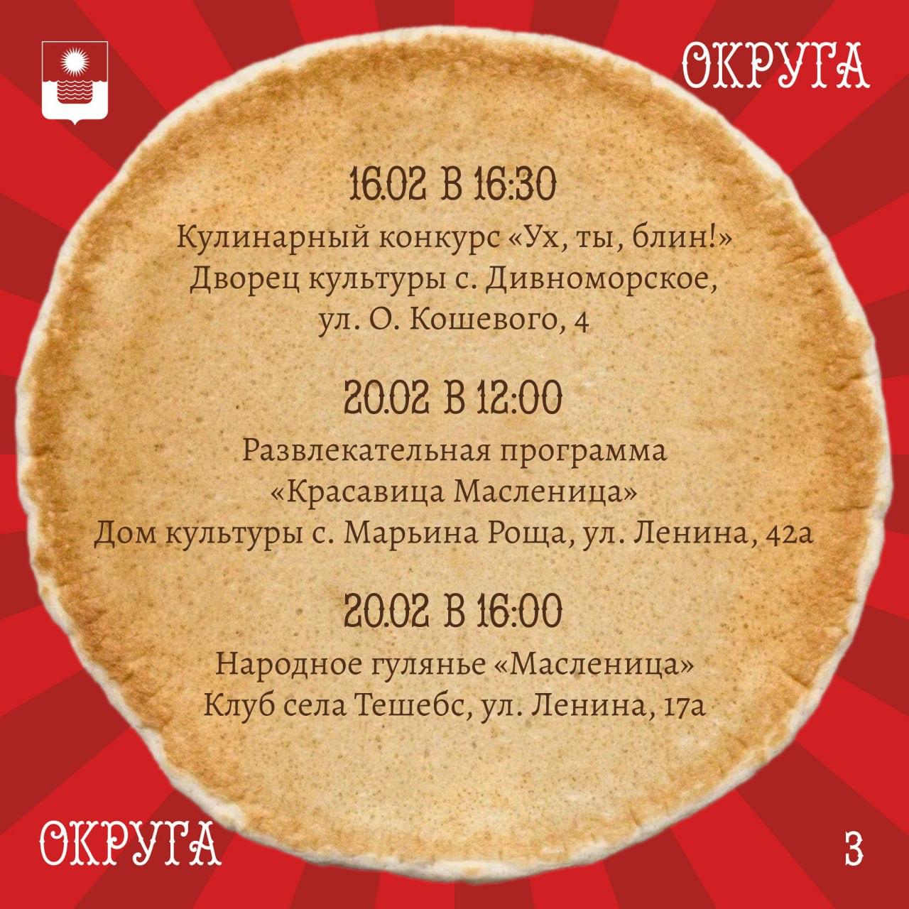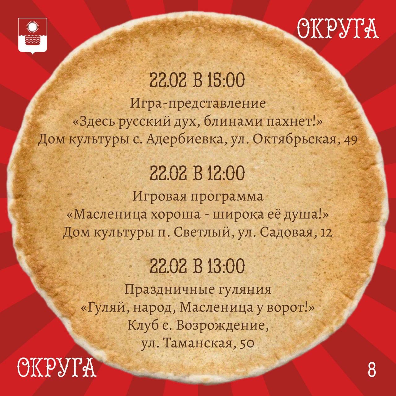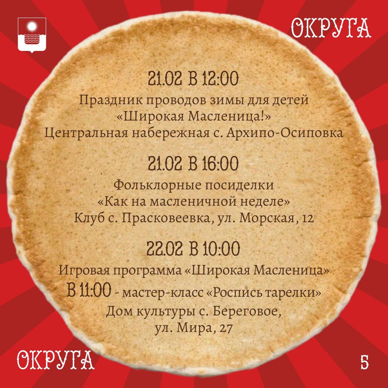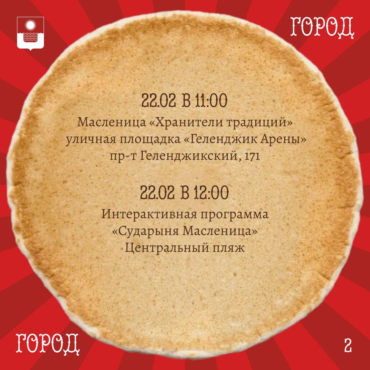 На Ярмарочной площади празднование Масленицы с блинами состоится 21 февраля в 11:00. В это же время на Центральном пляже Геленджика пройдут игры, а 22 февраля, в воскресенье, в 12:00 - интерактивная программа «Сударыня Масленица» со сжиганием чучела – древним ритуалом, означающим прощание с зимними холодами и встречу весеннего тепла. Подробнее о мероприятиях - читайте в карточках.Приходите всей семьёй, познакомьте юное поколение курорта с народными традициями.