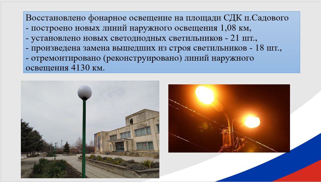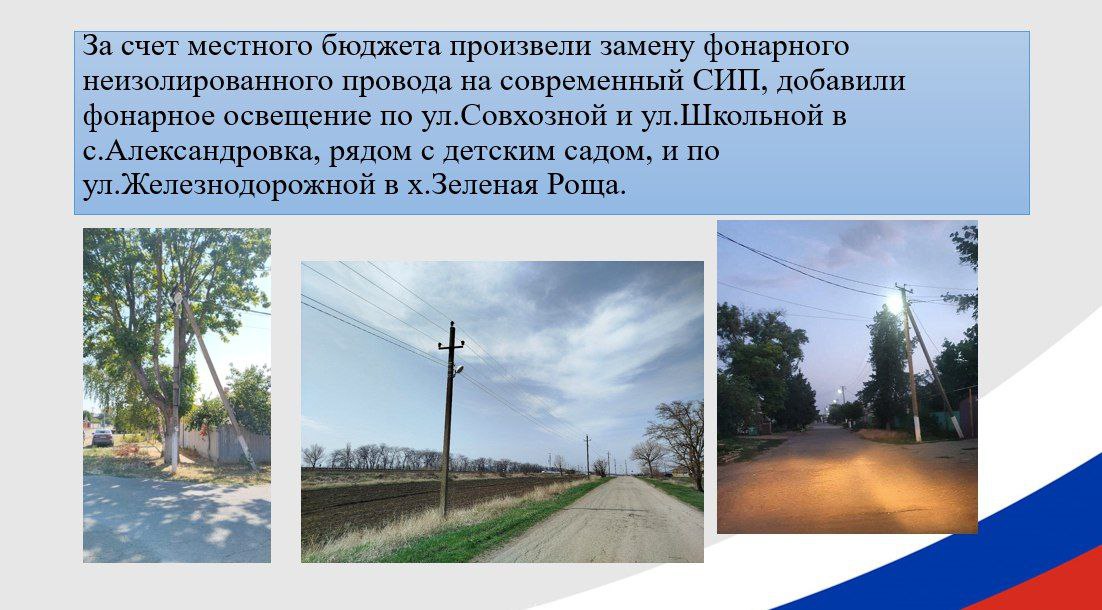 - Проведены линии фонарного освещения в п. Садовом по ул. Мира, на участке ул. Набережной и ул. Новокузнецкой; в х. Зеленая Роща по ул. Железнодорожной, въездной маршрут в обе стороны.