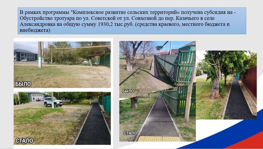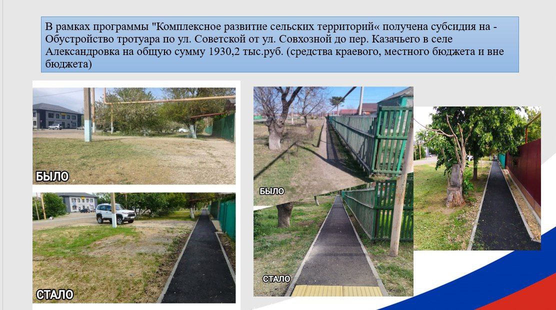 - По краевой программе "Комплексное развитие сельских территорий" обустроен тротуар в с. Александровке по ул. Советской от ул. Совхозной до пер. Казачьего;