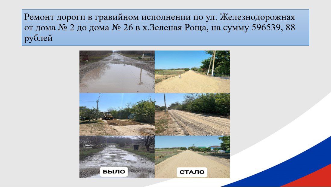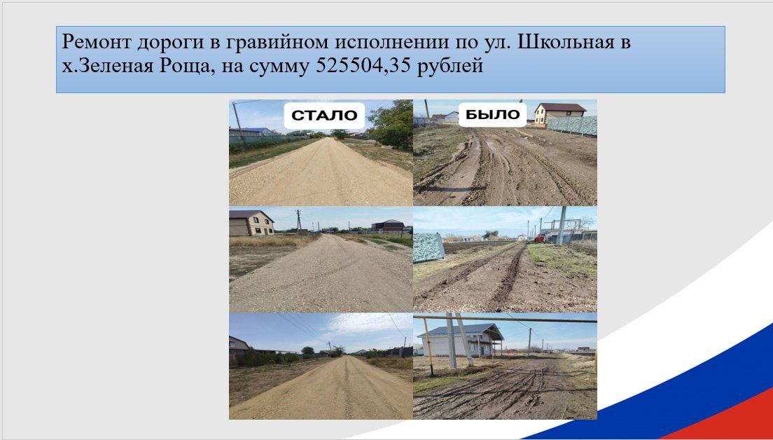 - В х. Зеленая Роща отремонтированы дороги в гравийном исполнении по ул. Железнодорожной от дома № 2 до дома № 26 и по ул. Школьной;