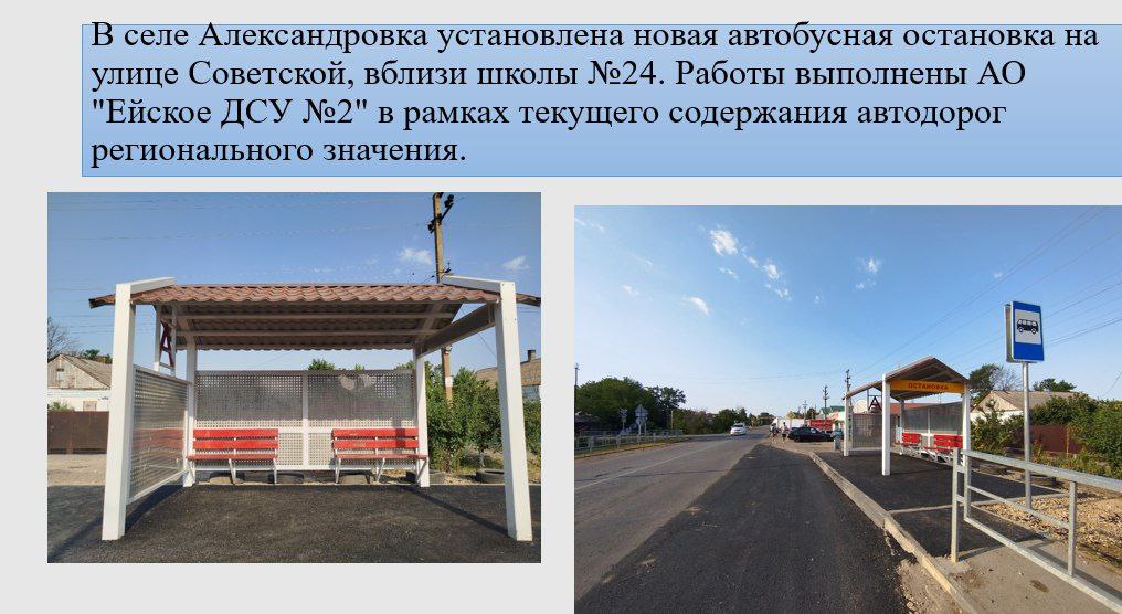 - В рамках текущего содержания автодорог регионального значения АО "Ейское ДСУ №2" в с. Александровке установило новую автобусную остановку на ул. Советской, вблизи школы №24;