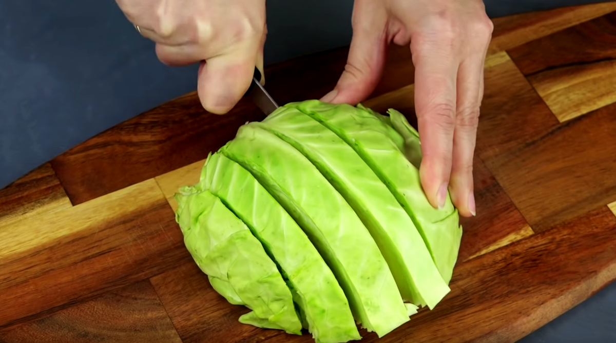 Для начала подготовим капусту. Сначала кочан делится пополам, после чего нарезается на кусочки толщиной примерно 1,5 см. Такой способ нарезки обеспечивает равномерное приготовление и сохранение яркого вкуса.