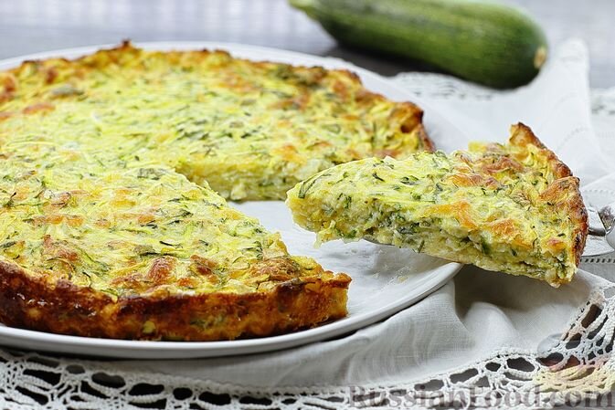 - Пирог-запеканка из кабачков с сыром. Это блюдо сочетает в себе тертые кабачки, сыр, лук и зелень, запеченные с молочной заливкой и мукой. Получается сочный пирог, который отлично подойдет как на обед, так и на ужин.