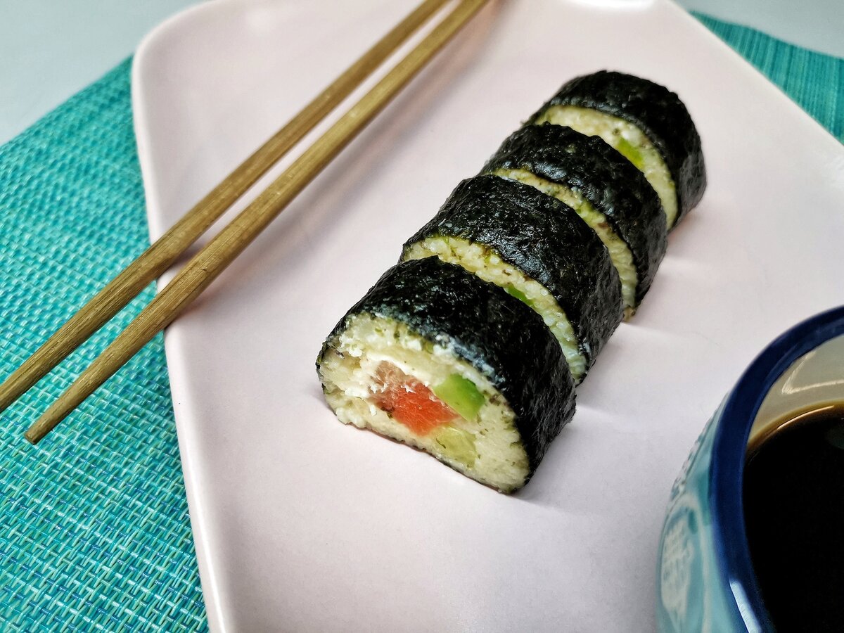Вначале цветную капусту следует отварить в подсоленной воде, доведя до кипения и убавив огонь. Это займет около 18 минут.Параллельно чеснок нужно разрезать пополам и добавить в кастрюлю с капустой.По истечении времени, капусту нужно отцеживать, а затем пюрировать с добавлением сливочного масла.После этого в массу вводится яйцо и все хорошо перемешивается. Если осталась излишняя жидкость, пюре необходимо отцеживать через сито или выпаривать на медленном огне.Огурец и авокадо нарезаются ломтиками толщиной около 7–8 мм, а лосось — на более тонкие кусочки.Форму для роллов заполняют цветной капустой или нори, смазывают сливочным сыром, затем выкладывают рыбу, авокадо и огурец.Скручивают ролл и нарезают его на удобные кусочки, используя холодный нож.Подавать с соевым соусом для завершения вкусового ансамбля!