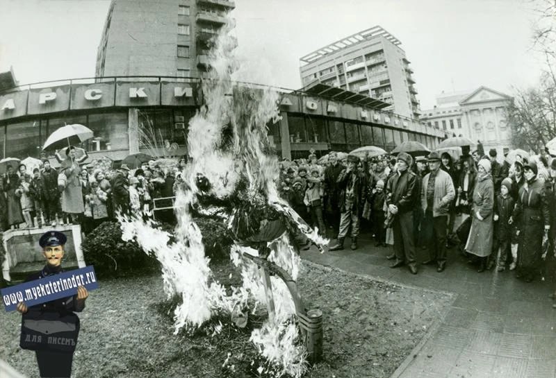 Ретро-кадры с главной улицы города! Посмотрите, как шумно и ярко провожали зиму в 1994 году прямо у Дома книги. Жители собрались на Красной, чтобы сжечь чучело Масленицы.