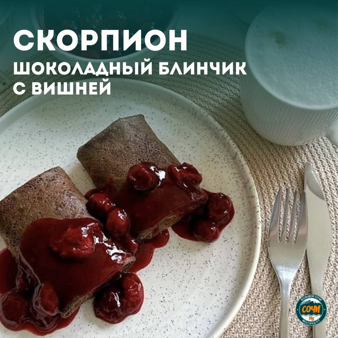 Шоколадный блинчик с вишней. Выглядит загадочно, вкус раскрывается постепенно. Ты не любишь простоту и всегда оставляешь пространство для тайны.