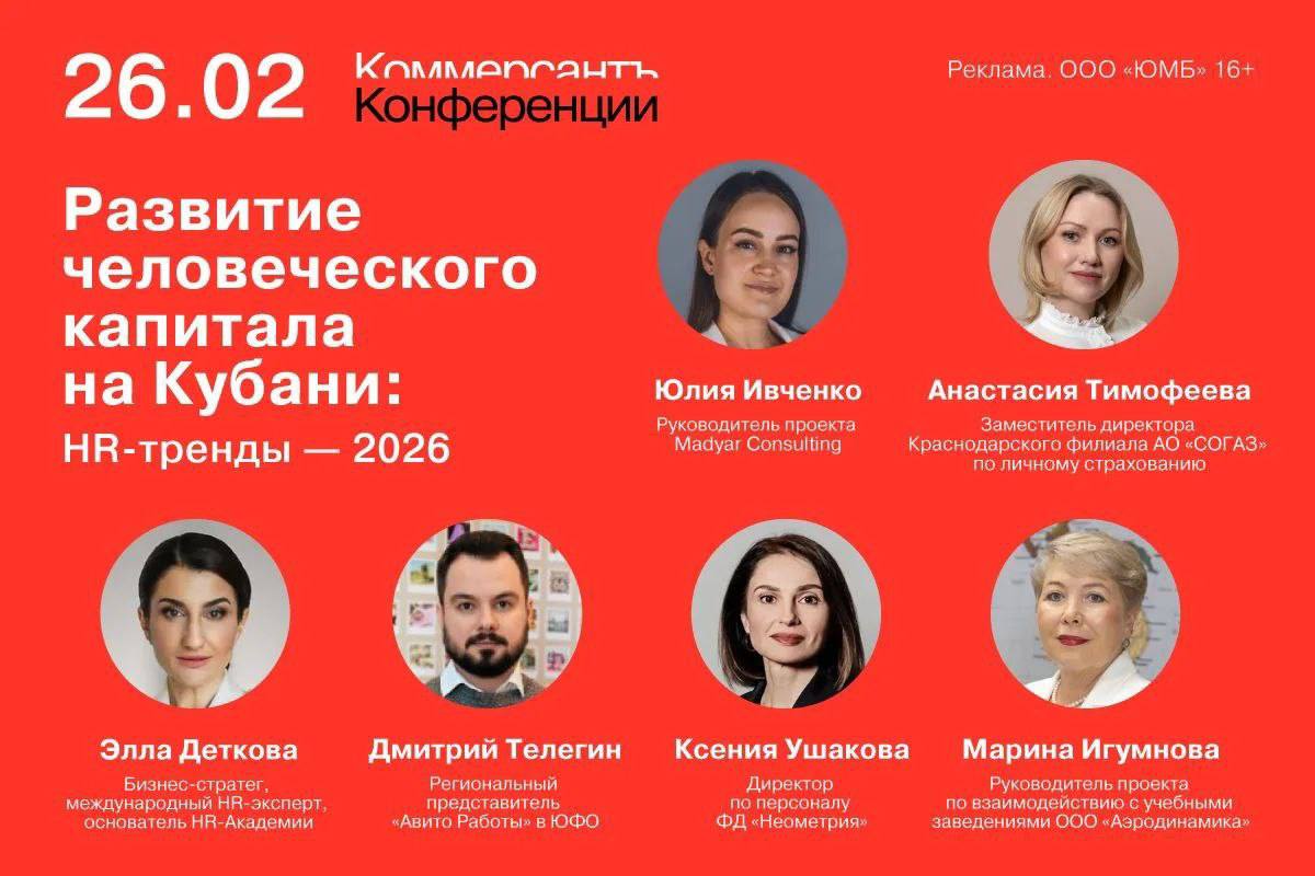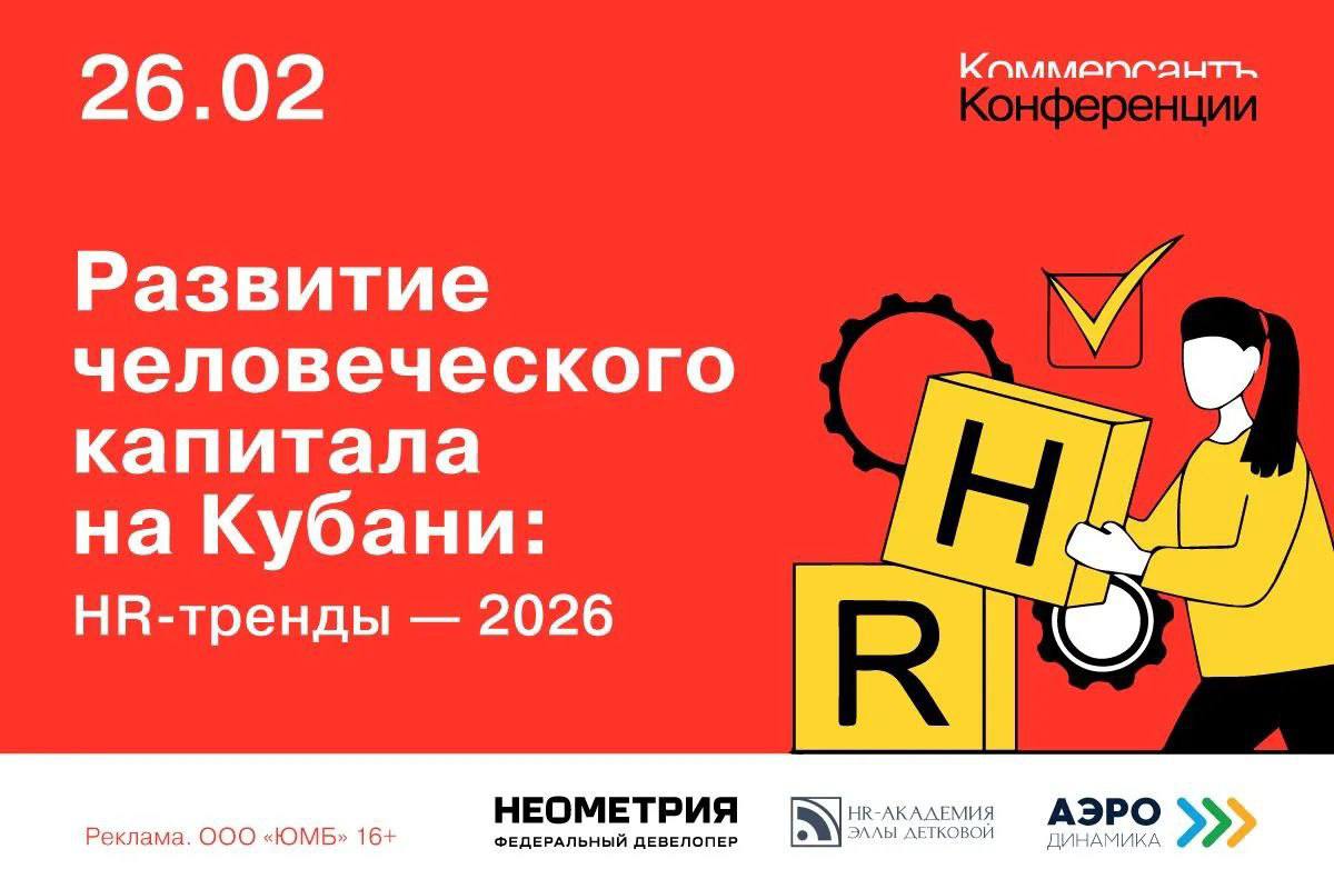 26 февраля в Краснодаре пройдет круглый стол делового издания «Коммерсантъ — Кубань-Черноморье» на тему: «Развитие человеческого капитала на Кубани: HR-тренды — 2026». Эксперты обсудят актуальные тенденции рынка труда, вопросы формирования эффективных команд, трудоустройства и адаптации сотрудников, а также поделятся успешными практиками управления персоналом.