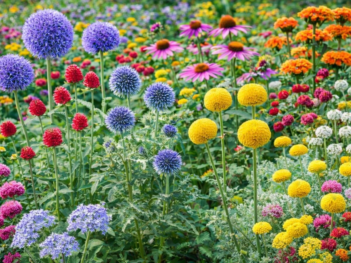 Среди однолетников выделяются такие растения, как гомфрена и краспедия: они устойчивы к жаре и идеальны для срезки. Для многолетних посадок особенно популярны декоративные луки и мордовник, которые удерживают свою форму даже после цветения.
