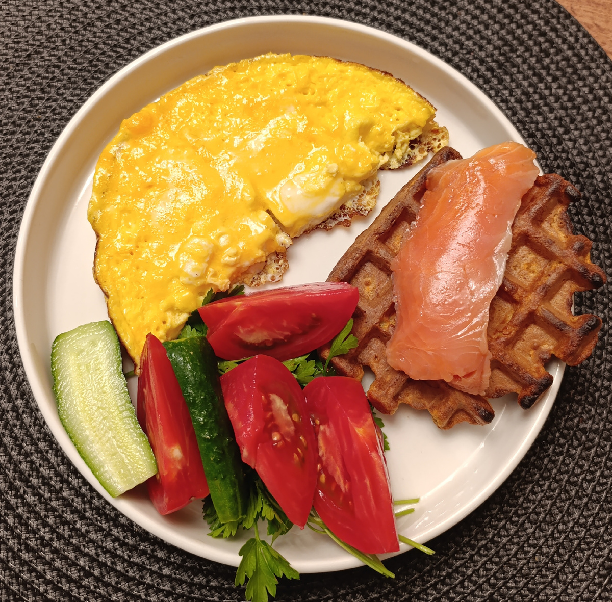 Утренний прием пищи стартовал с аппетитного омлета, который сочетался с легкой кабачковой вафлей и порцией соленой рыбы. Этот рацион был дополнен свежими овощами и зеленью, а всё это завершалось чашкой ароматного кофе с молоком. Хотя кашу утром не включили, ощущение сытости не покидало. Формула: углеводы, белок и клетчатка действительно работает.