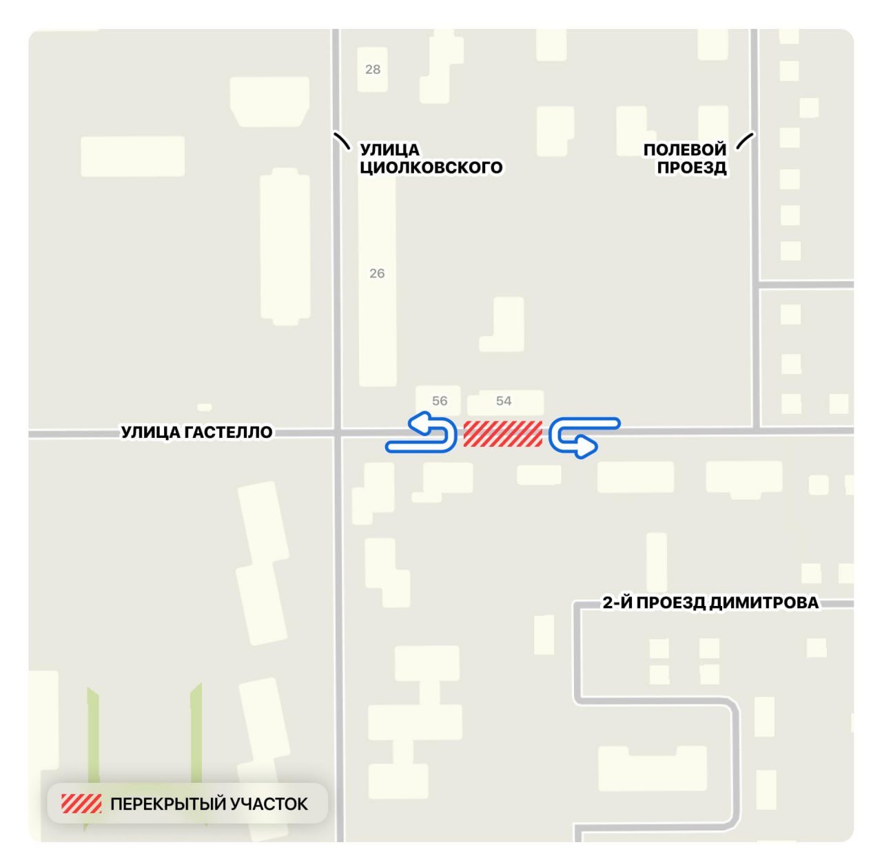 Это нужно для ремонтных работ на тепловой сети. Сквозной проезд по улице Гастелло от улицы Циолковского до улицы Полевой будет невозможен. Для объезда предлагают использовать улицу Лазурную.