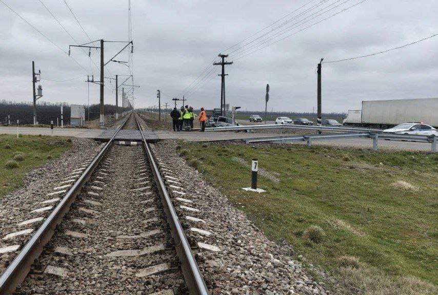 Сегодня днём на ж/д переезде между станциями Двубратский и Усть-Лабинск локомотив столкнул возникший неизвестно откуда (при закрытом шлагбауме и красном семафоре) на пути легковой автомобиль.
