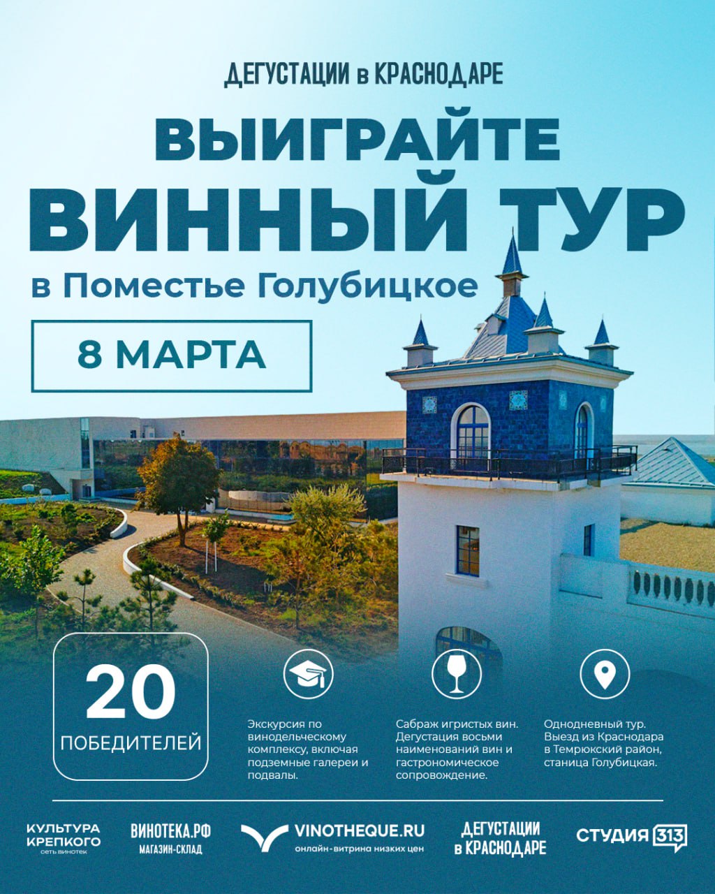 Участвуйте в нашем конкурсе и получите шанс отправиться на однодневную VIP-экскурсию в одну из самых впечатляющих виноделен Кубани. Всего выберем 20 победителей
