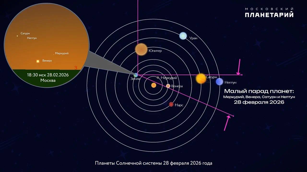 В «ряд» у горизонта выстроятся шесть небесных тел: Меркурий, Венера, Сатурн, Юпитер, Уран и Нептун. Большинство из них можно будет увидеть невооруженным глазом.