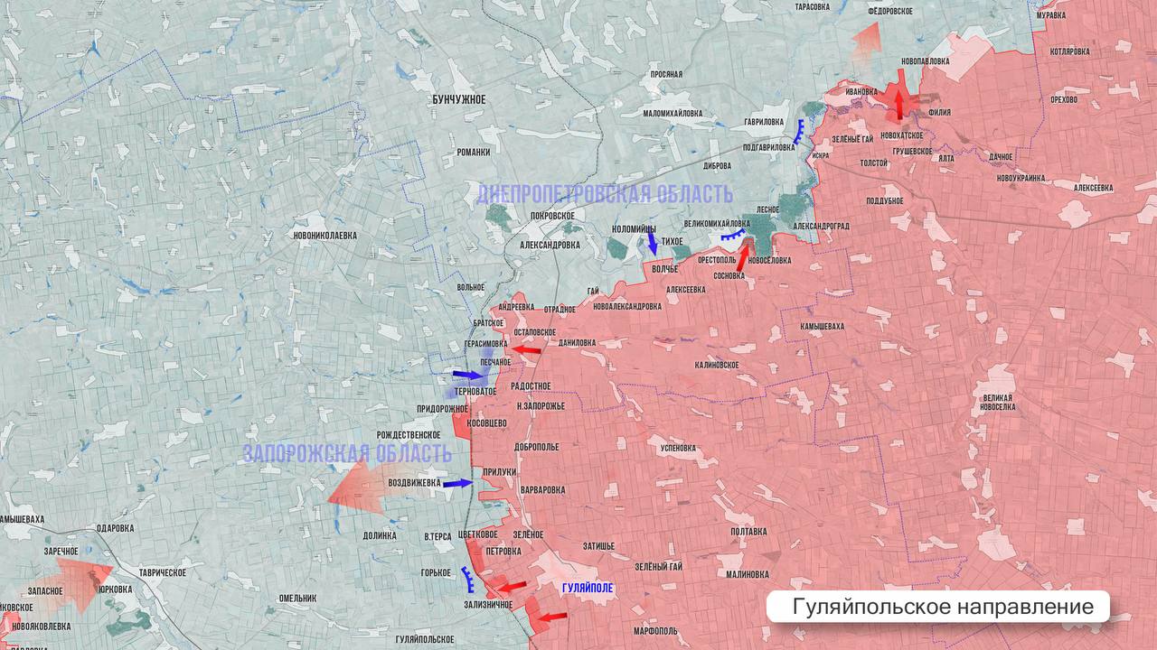 На Гуляйпольском участке ВС РФ продвигаются в «кармане» восточнее Гуляйпольского. Западнее Староукраинки армия Россия установила контроль над важным районом обороны ВСУ площадью ~6 км и освободила ещё одно село в Запорожской обл – Горькое. Контроль над этим селом значим для дальнейшего наступления на запад и освобождения Верхней Терсы и Воздвижевки. Есть успехи севернее Риздвянки.